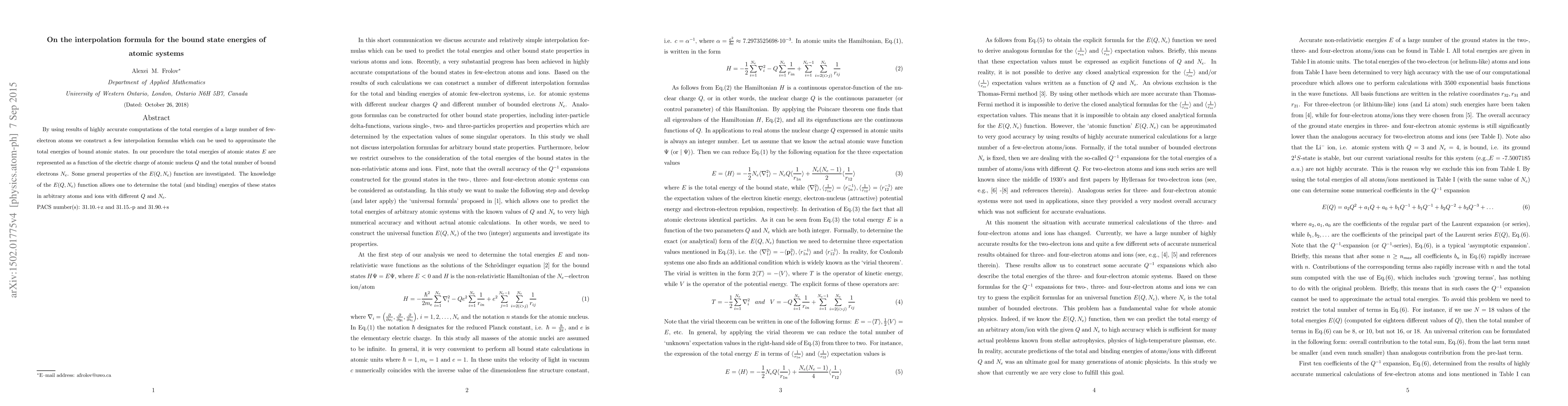 By using results of highly accurate computations of the total energies of a large number of few-electron atoms we construct a few interpolation formulas which can be used to approximate the total energies of bound atomic states. In our procedure the total energies of atomic states $E$ are represented as a function of the electric charge of atomic nucleus $Q$ and the total number of bound electrons $N_e$. Some general properties of the $E(Q, N_e)$ function are investigated. The knowledge of the $E(Q, N_e)$ function allows one to determine the total (and binding) energies of these states in arbitrary atoms and ions with different $Q$ and $N_e$.