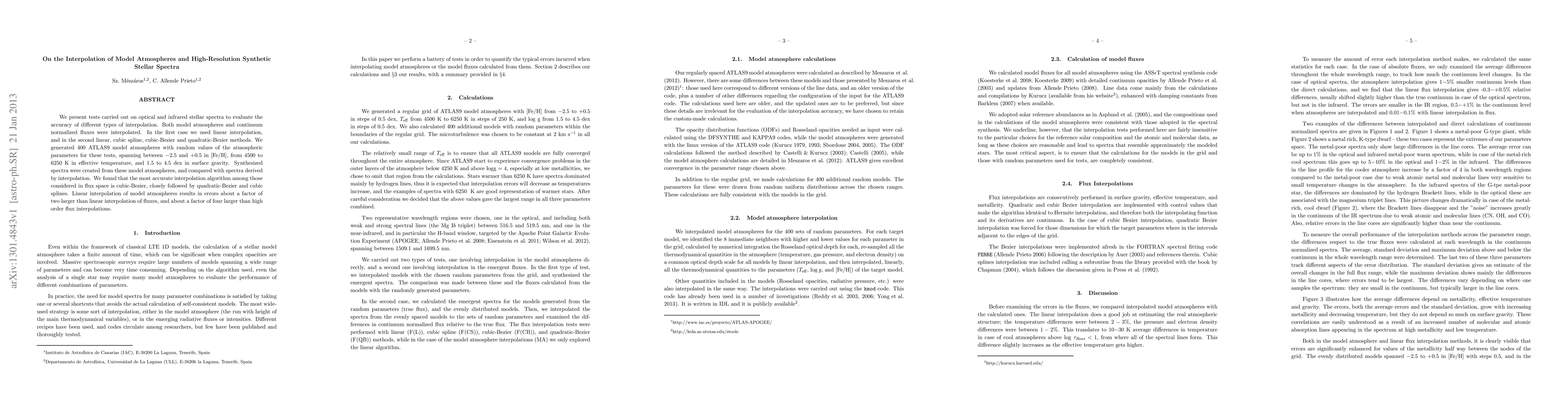 We present tests carried out on optical and infrared stellar spectra to evaluate the accuracy of different types of interpolation. Both model atmospheres and continuum normalized fluxes were interpolated. In the first case we used linear interpolation, and in the second linear, cubic spline, cubic-Bezier and quadratic-Bezier methods. We generated 400 ATLAS9 model atmospheres with random values of the atmospheric parameters for these tests, spanning between -2.5 and +0.5 in [Fe/H], from 4500 to 6250 K in effective temperature, and 1.5 to 4.5 dex in surface gravity. Synthesized spectra were created from these model atmospheres, and compared with spectra derived by interpolation. We found that the most accurate interpolation algorithm among those considered in flux space is cubic-Bezier, closely followed by quadratic-Bezier and cubic splines. Linear interpolation of model atmospheres results in errors about a factor of two larger than linear interpolation of fluxes, and about a factor of four larger than high order flux interpolations.