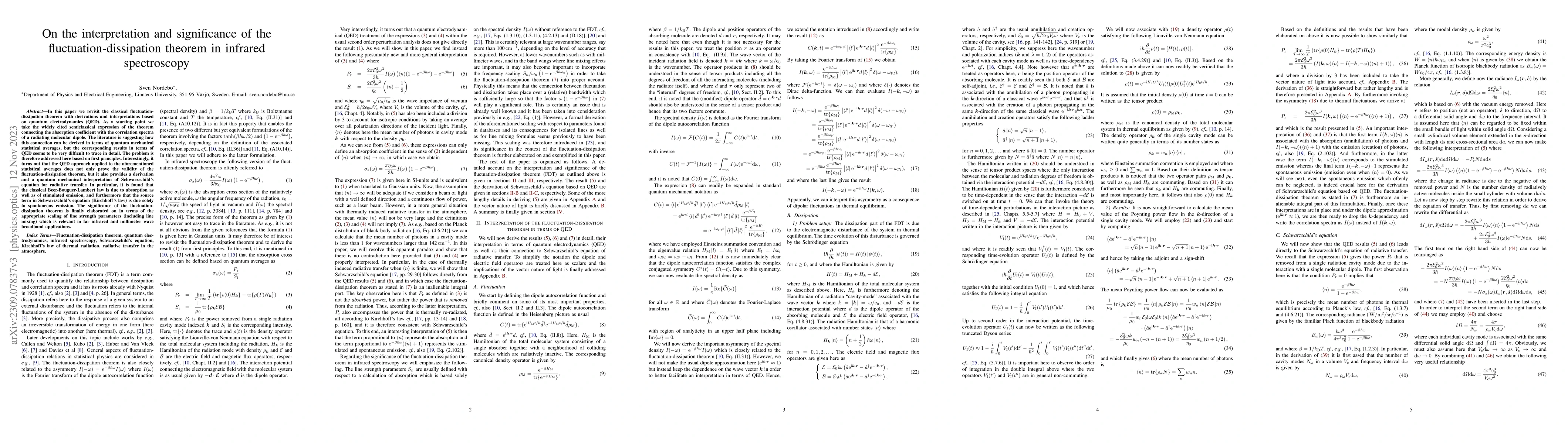 This paper revisits the classical fluctuation-dissipation theorem using quantum electrodynamics (QED) to derive and interpret its significance in infrared spectroscopy, revealing that QED provides a quantum mechanical interpretation of Schwarzschild's equation for radiative transfer and highlights the role of spontaneous emission in Kirchhoff's law. The study also discusses the scaling of line strength parameters relevant to far infrared and millimeter wave applications.