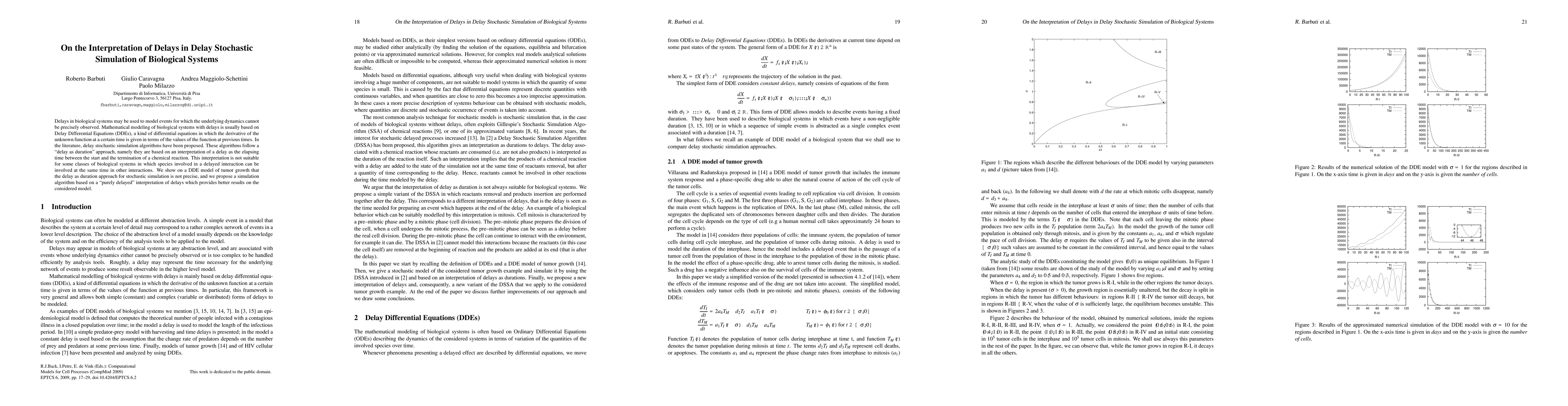 Delays in biological systems may be used to model events for which the underlying dynamics cannot be precisely observed. Mathematical modeling of biological systems with delays is usually based on Delay Differential Equations (DDEs), a kind of differential equations in which the derivative of the unknown function at a certain time is given in terms of the values of the function at previous times. In the literature, delay stochastic simulation algorithms have been proposed. These algorithms follow a "delay as duration" approach, namely they are based on an interpretation of a delay as the elapsing time between the start and the termination of a chemical reaction. This interpretation is not suitable for some classes of biological systems in which species involved in a delayed interaction can be involved at the same time in other interactions. We show on a DDE model of tumor growth that the delay as duration approach for stochastic simulation is not precise, and we propose a simulation algorithm based on a ``purely delayed'' interpretation of delays which provides better results on the considered model.
