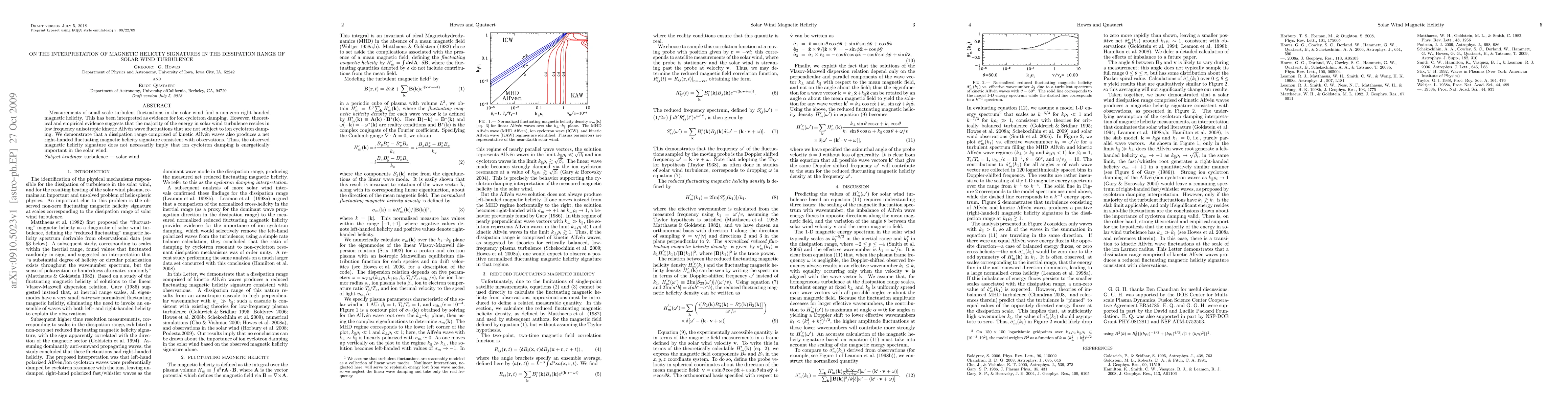 This paper argues that the observed right-handed magnetic helicity in solar wind turbulence does not necessarily indicate ion cyclotron damping, as it can also be produced by low-frequency kinetic Alfven waves. The findings suggest that these Alfven waves, which are not subject to ion cyclotron damping, may play a significant role in the dissipation range of solar wind turbulence.
