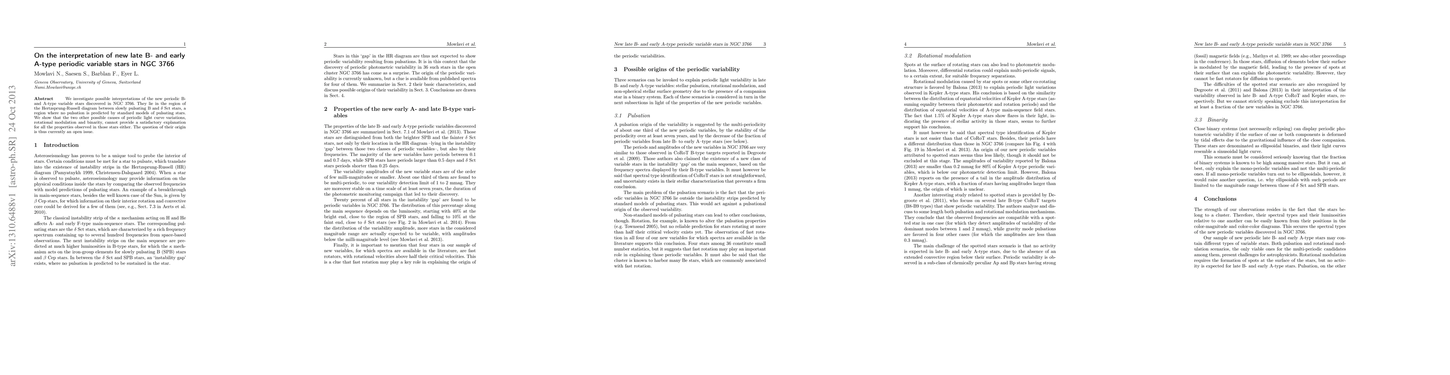 We investigate possible interpretations of the new periodic B- and A-type variable stars discovered in NGC 3766. They lie in the region of the Hertzsprung-Russell diagram between slowly pulsating B and delta Sct stars, a region where no pulsation is predicted by standard models of pulsating stars. We show that the two other possible causes of periodic light curve variations, rotational modulation and binarity, cannot provide a satisfactory explanation for all the properties observed in those stars either. The question of their origin is thus currently an open issue.