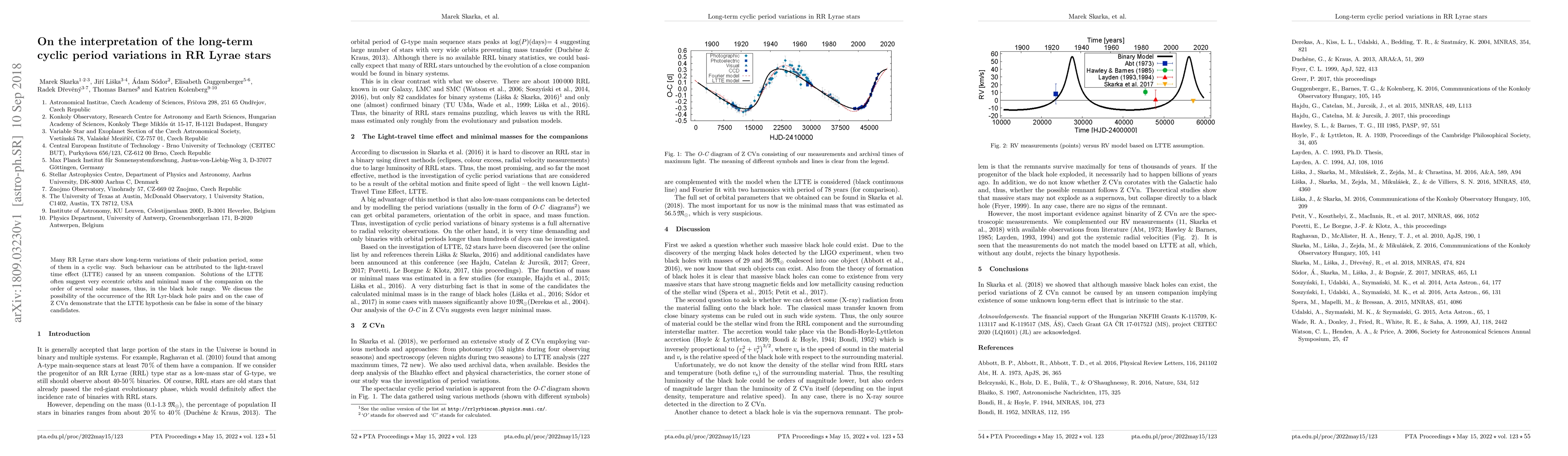 Many RR Lyrae stars show long-term variations of their pulsation period, some of them in a cyclic way. Such behaviour can be attributed to the light-travel time effect (LTTE) caused by an unseen companion. Solutions of the LTTE often suggest very eccentric orbits and minimal mass of the companion on the order of several solar masses, thus, in the black hole range. We discuss the possibility of the occurrence of the RR Lyr-black hole pairs and on the case of Z CVn demonstrate that the LTTE hypothesis can be false in some of the binary candidates.