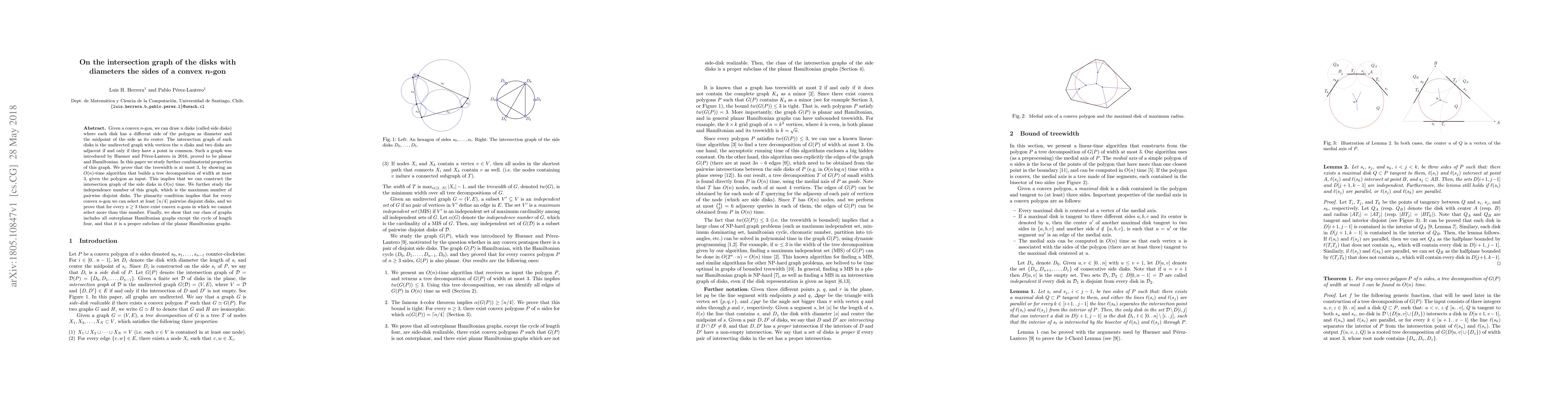 Given a convex $n$-gon, we can draw $n$ disks (called side disks) where each disk has a different side of the polygon as diameter and the midpoint of the side as its center. The intersection graph of such disks is the undirected graph with vertices the $n$ disks and two disks are adjacent if and only if they have a point in common. Such a graph was introduced by Huemer and P\'erez-Lantero in 2016, proved to be planar and Hamiltonian. In this paper we study further combinatorial properties of this graph. We prove that the treewidth is at most 3, by showing an $O(n)$-time algorithm that builds a tree decomposition of width at most 3, given the polygon as input. This implies that we can construct the intersection graph of the side disks in $O(n)$ time. We further study the independence number of this graph, which is the maximum number of pairwise disjoint disks. The planarity condition implies that for every convex $n$-gon we can select at least $\lceil n/4 \rceil$ pairwise disjoint disks, and we prove that for every $n\ge 3$ there exist convex $n$-gons in which we cannot select more than this number. Finally, we show that our class of graphs includes all outerplanar Hamiltonian graphs except the cycle of length four, and that it is a proper subclass of the planar Hamiltonian graphs.