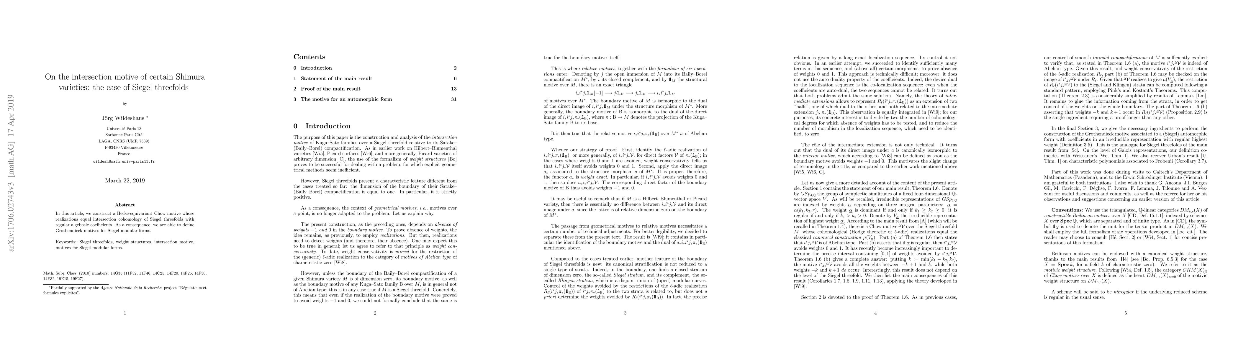 In this article, we construct a Hecke-equivariant Chow motive whose realizations equal intersection cohomology of Siegel threefolds with regular algebraic coefficients. As a consequence, we are able to define Grothendieck motives for Siegel modular forms.