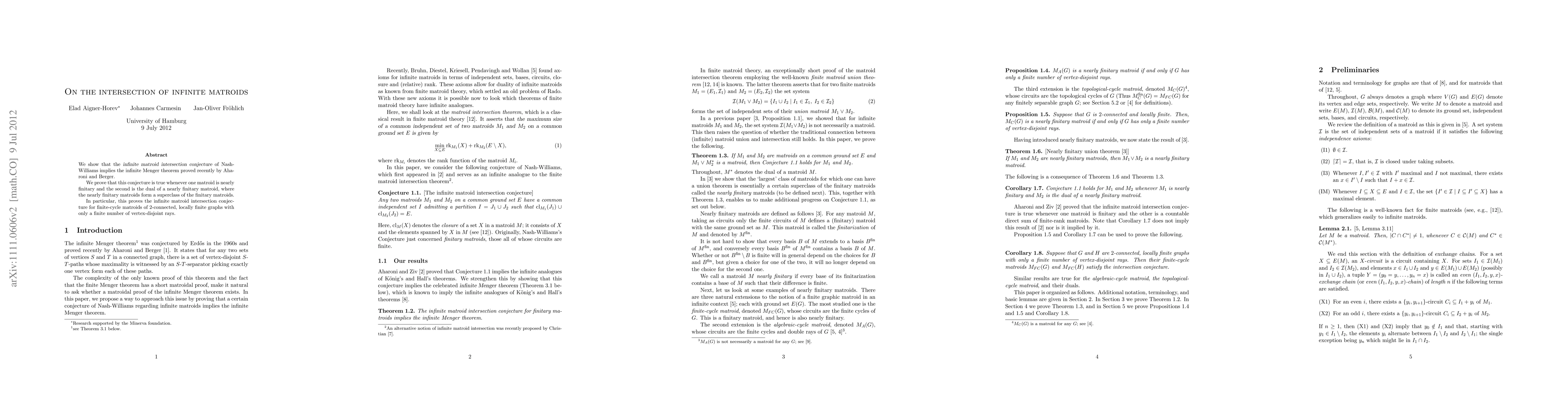 Summary: The paper proves the infinite matroid intersection conjecture under specific conditions, showing its implication for the infinite Menger theorem. It establishes the conjecture's validity for nearly finitary matroids and their duals, specifically for finite-cycle matroids in 2-connected, locally finite graphs with limited vertex-disjoint rays.