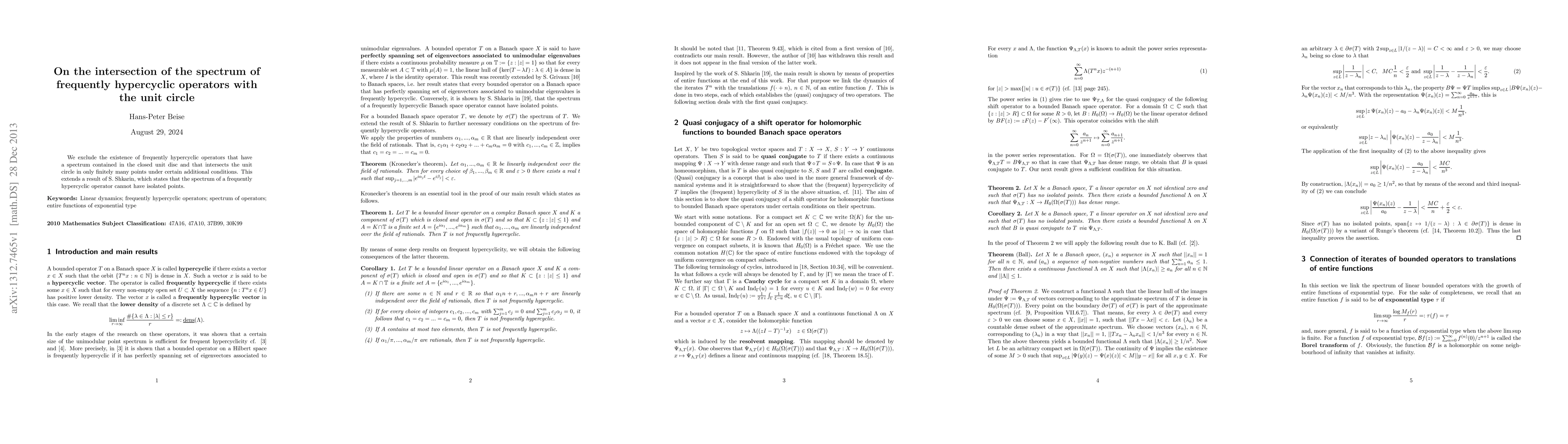 Summary: This paper proves that frequently hypercyclic operators cannot have a spectrum within the closed unit disc that intersects the unit circle in finitely many points, extending a prior result by S. Shkarin on the non-existence of isolated points in the spectrum of such operators.