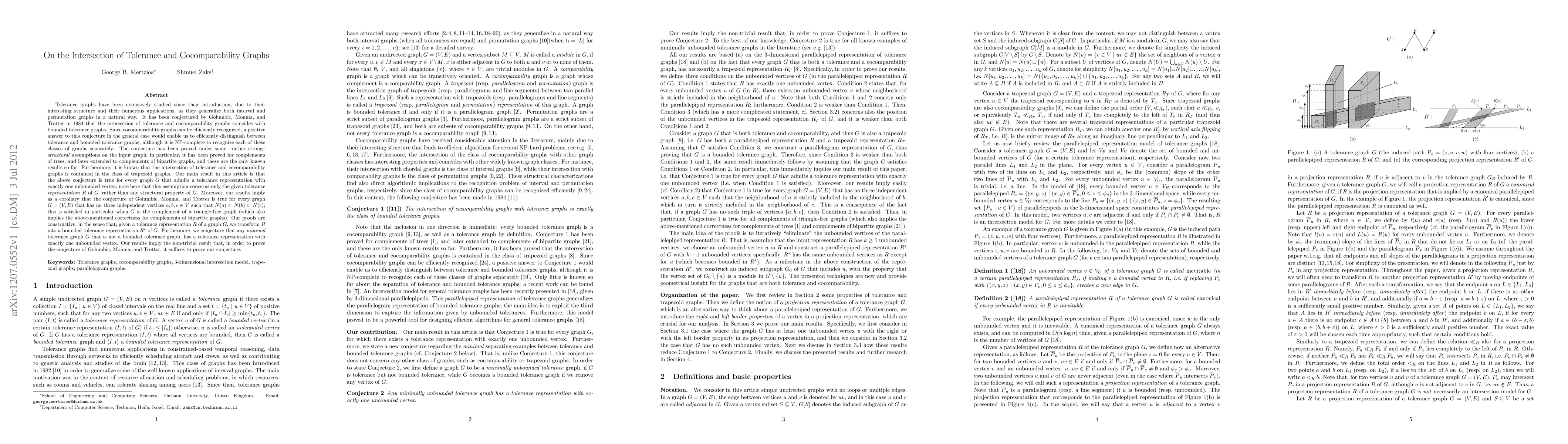 The paper presents a novel approach to proving the coincidence of tolerance and cocomparability graph intersections by transforming tolerance representations with a single unbounded vertex into bounded ones.