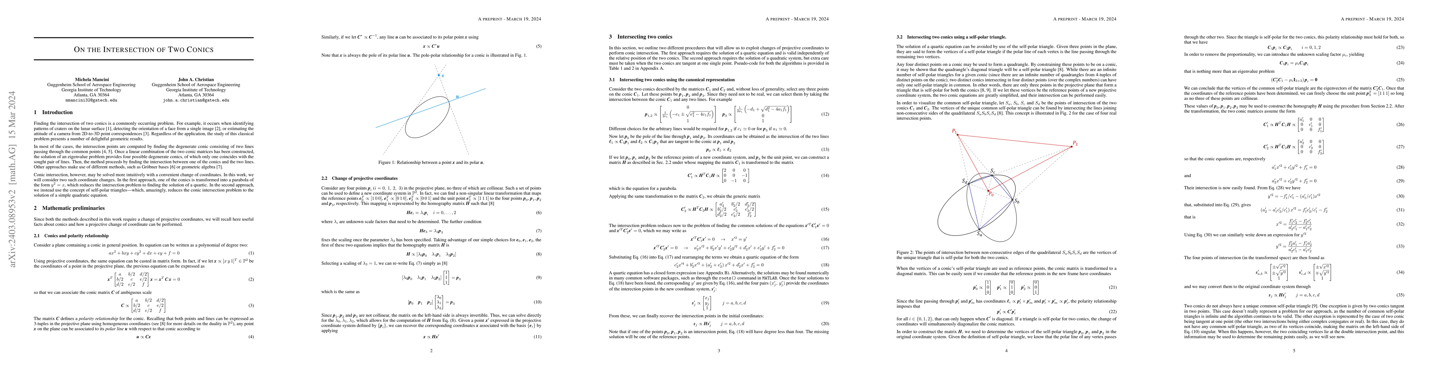 This paper explores methods to find the intersection points of two conics, utilizing both degenerate conic solutions and coordinate transformations. It introduces two intuitive approaches: transforming one conic into a parabola to solve a quartic, and using self-polar triangles to solve a quadratic equation.