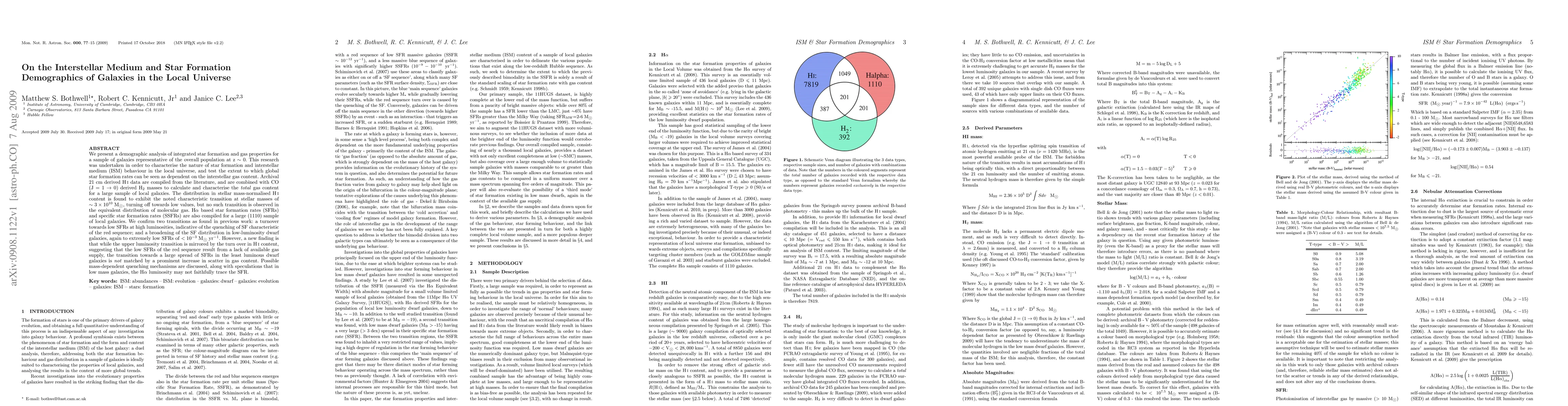 This paper conducts a demographic analysis of star formation and interstellar medium properties in local galaxies, finding a transition in gas content at stellar masses of ~3x10^10 M_sun linked to low star formation rates in red sequence galaxies, while low-luminosity dwarf galaxies show a broad spread in star formation rates without a corresponding increase in gas content scatter.
