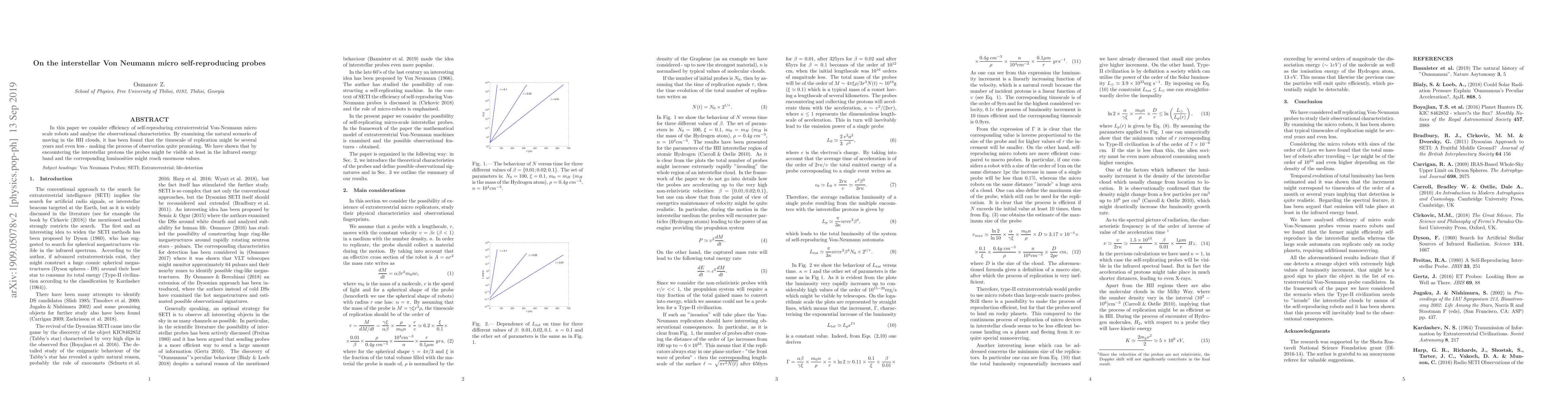 In this paper we consider efficiency of self-reproducing extraterrestrial Von-Neumann micro scale robots and analyse the observational characteristics. By examining the natural scenario of moving in the HII clouds, it has been found that the timescale of replication might be several years and even less - making the process of observation quite promising. We have shown that by encountering the interstellar protons the probes might be visible at least in the infrared energy band and the corresponding luminosities might reach enormous values.