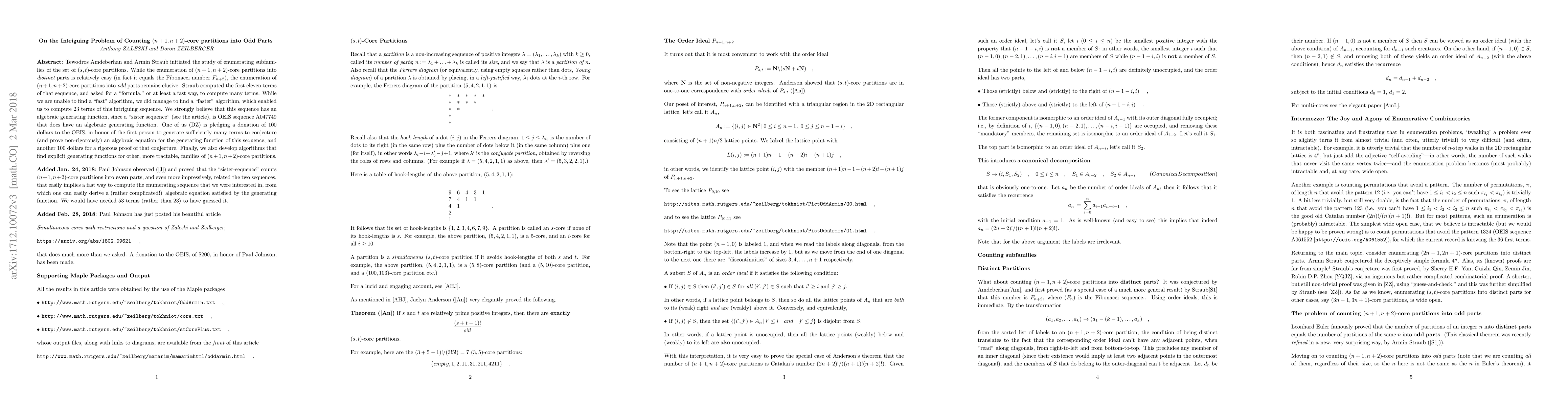 This paper investigates the challenging problem of counting (n+1,n+2)-core partitions into odd parts, which remains elusive despite Fibonacci-sequence solutions for distinct parts. The authors computed 23 terms of this sequence using a 'faster' algorithm, suggesting a potential algebraic generating function. They also present methods to derive generating functions for other tractable (n+1,n+2)-core partition families, offering rewards for proving conjectures about the sequence's generating function.