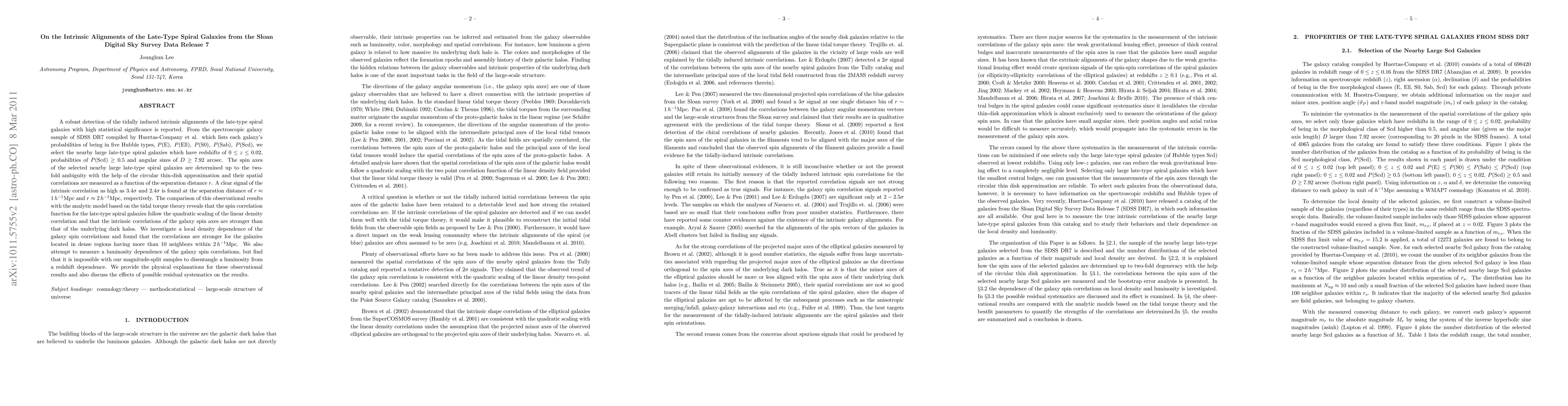 A robust detection of the tidally induced intrinsic alignments of the late-type spiral galaxies with high statistical significance is reported. From the spectroscopic galaxy sample of SDSS DR7 compiled by Huertas-Company et al. which lists each galaxy's probabilities of being in five Hubble types, P(E),P(Ell), P(S0),P(Sab), P(Scd), we select the nearby large late-type spiral galaxies which have redshifts of 0<=z<=0.02, probabilities of P(Scd)>=0.5 and angular sizes of D>=7.92 arcsec. The spin axes of the selected nearby large late-type spiral galaxies are determined up to the two-fold ambiguity with the help of the circular thin-disk approximation and their spatial correlations are measured as a function of the separation distance r. A clear signal of the intrinsic correlation as high as 3.4 sigma and 2.4 sigma is found at the separation distance of r~1Mpc/h and r~2Mpc/h, respectively. The comparison of this observational results with the analytic model based on the tidal torque theory reveals that the spin correlation function for the late-type spiral galaxies follow the quadratic scaling of the linear density correlation and that the intrinsic correlations of the galaxy spin axes are stronger than that of the underlying dark halos. We investigate a local density dependence of the galaxy spin correlations and found that the correlations are stronger for the galaxies located in dense regions having more than 10 neighbors within 2Mpc/h. We also attempt to measure a luminosity dependence of the galaxy spin correlations, but find that it is impossible with our magnitude-split samples to disentangle a luminosity from a redshift dependence. We provide the physical explanations for these observational results and also discuss the effects of possible residual systematics on the results.