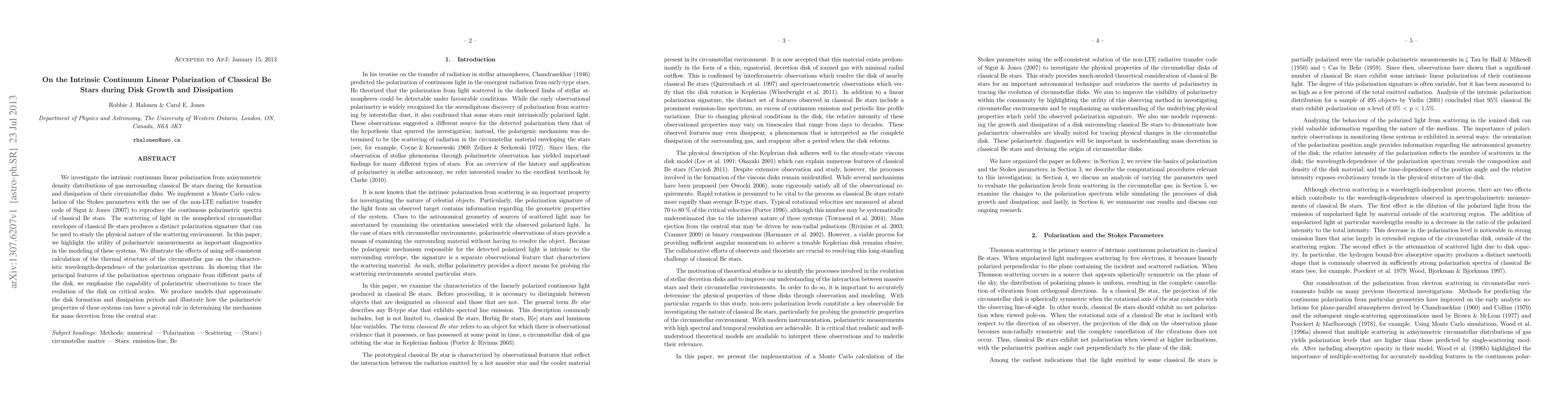 This paper investigates the intrinsic linear polarization of classical Be stars during disk formation and dissipation, using Monte Carlo calculations to model the scattering of light in their nonspherical envelopes. It highlights the importance of polarimetric measurements in understanding the physical nature of the circumstellar environment and the evolution of the disk.