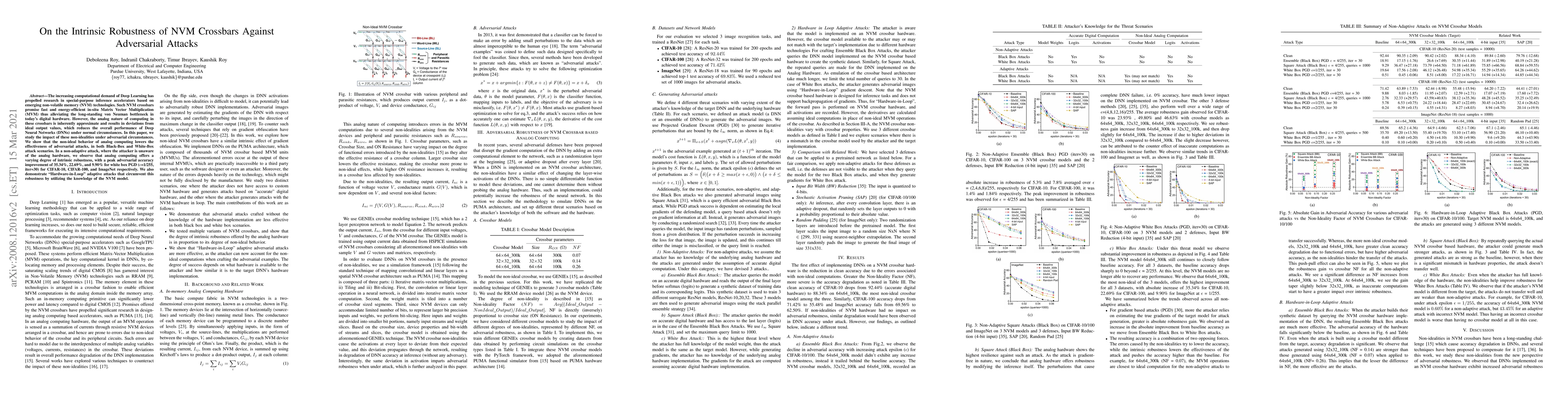 This paper investigates the intrinsic robustness of NVM crossbars against adversarial attacks, showing that their analog nature reduces the effectiveness of such attacks. It finds that non-ideal analog computing provides a degree of intrinsic robustness, with notable improvements in adversarial accuracy under non-adaptive attacks, but adaptive attacks can still overcome this robustness by exploiting knowledge of the NVM model.