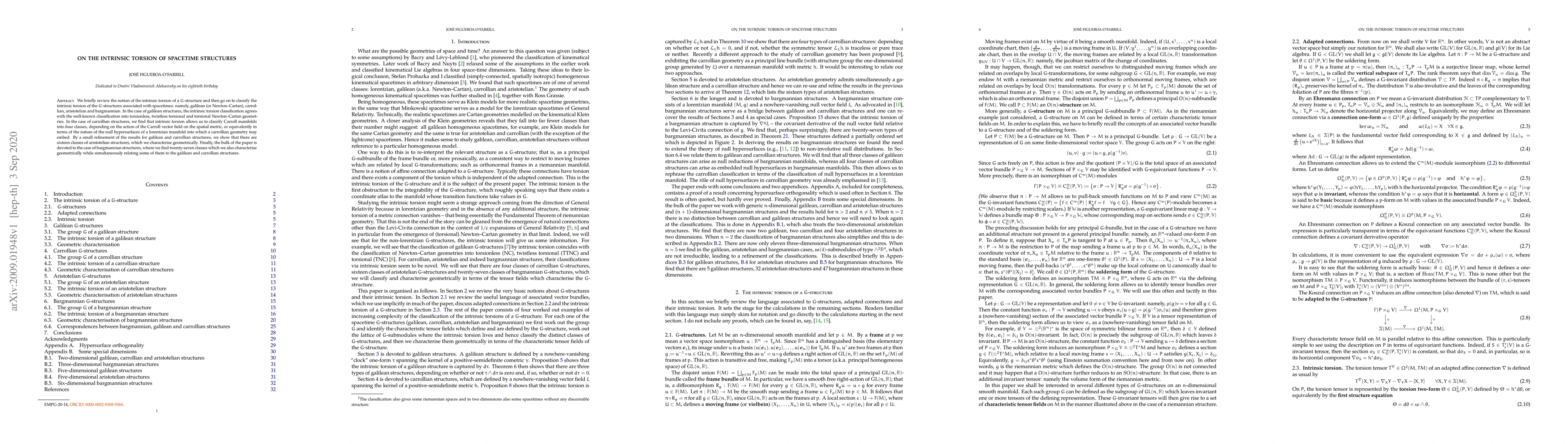 We briefly review the notion of the intrinsic torsion of a $G$-structure and then go on to classify the intrinsic torsion of the $G$-structures associated with spacetimes: namely, galilean (or Newton-Cartan), carrollian, aristotelian and bargmannian. In the case of galilean structures, the intrinsic torsion classification agrees with the well-known classification into torsionless, twistless torsional and torsional Newton-Cartan geometries. In the case of carrollian structures, we find that intrinsic torsion allows us to classify Carroll manifolds into four classes, depending on the action of the Carroll vector field on the spatial metric, or equivalently in terms of the nature of the null hypersurfaces of a lorentzian manifold into which a carrollian geometry may embed. By a small refinement of the results for galilean and carrollian structures, we show that there are sixteen classes of aristotelian structures, which we characterise geometrically. Finally, the bulk of the paper is devoted to the case of bargmannian structures, where we find twenty-seven classes which we also characterise geometrically while simultaneously relating some of them to the galilean and carrollian structures. This paper is dedicated to Dmitri Vladimirovich Alekseevsky on his 80th birthday.