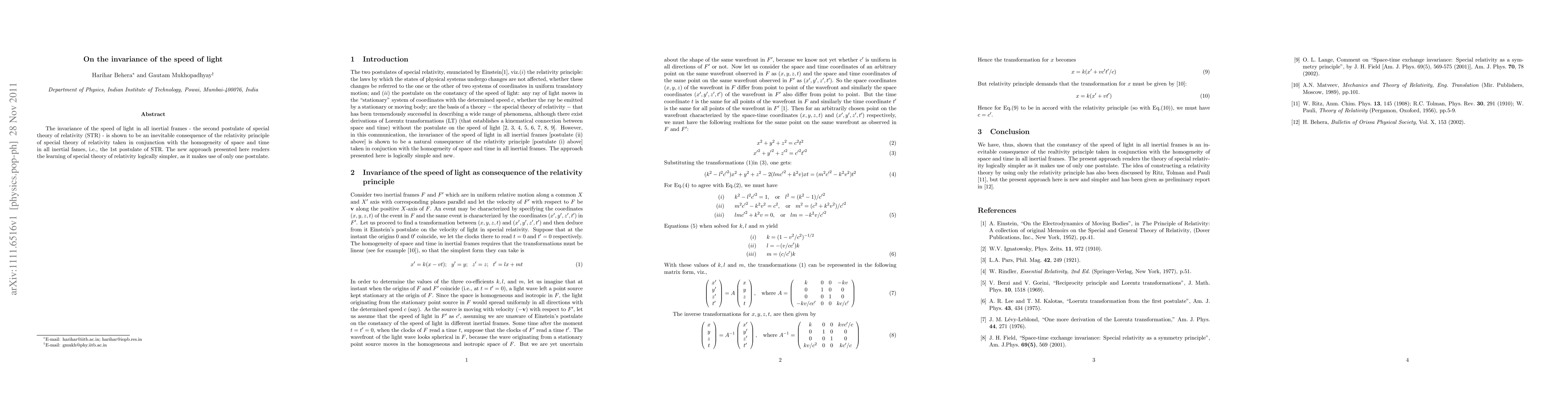 This paper demonstrates that the invariance of the speed of light across all inertial frames is a necessary outcome when combining the relativity principle with the homogeneity of space and time, simplifying the understanding of special relativity to just one postulate.