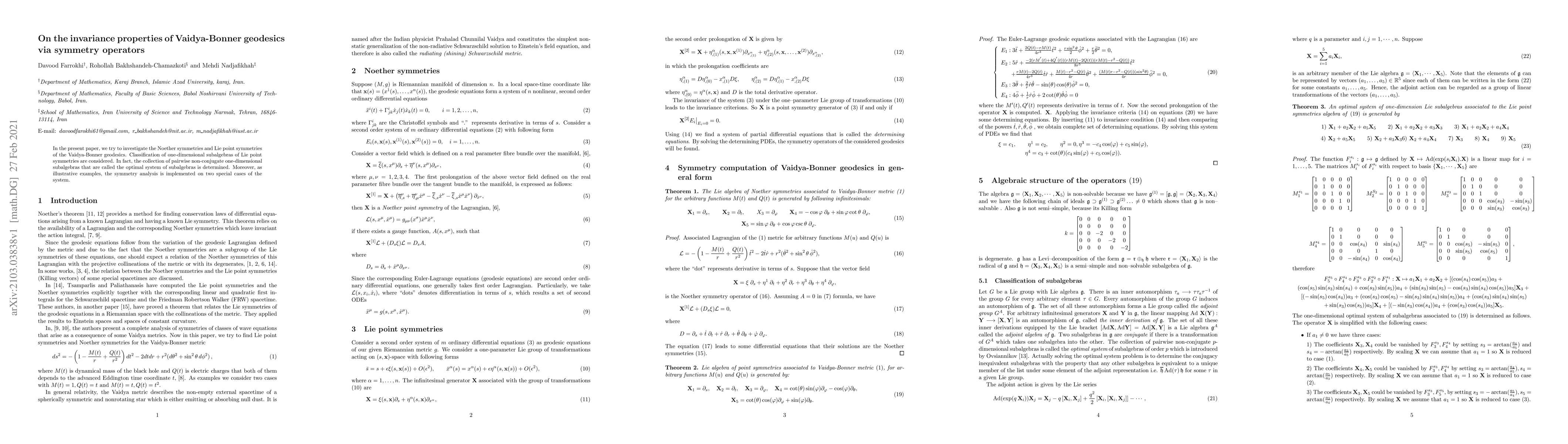 In the present paper, we try to investigate the Noether symmetries and Lie point symmetries of the Vaidya-Bonner geodesics. Classification of one-dimensional subalgebras of Lie point symmetries are considered. In fact, the collection of pairwise non-conjugate one-dimensional subalgebras that are called the optimal system of subalgebras is determined. Moreover, as illustrative examples, the symmetry analysis is implemented on two special cases of the system.
