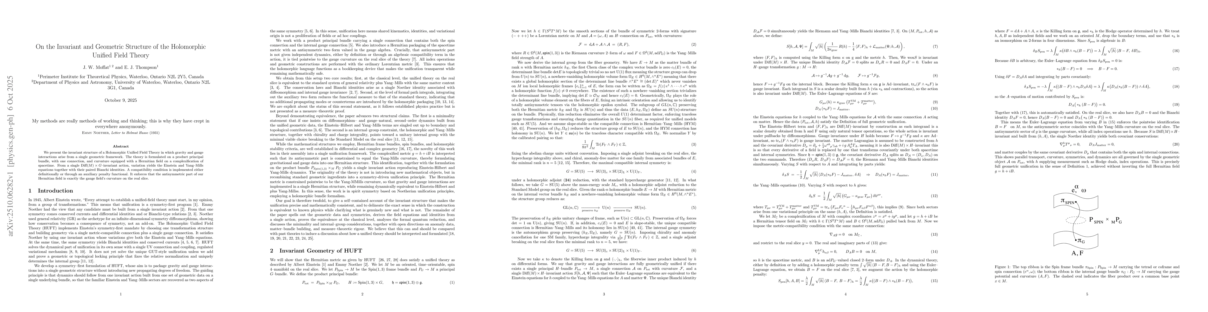 We present the invariant structure of a Holomorphic Unified Field Theory in which gravity and gauge interactions arise from a single geometric framework. The theory is formulated on a product principal bundle, with one connection, and curvature equipped with a Hermitian field on a complexification of spacetime. From a single Diff(M) $\times$ G-invariant action, variation yields the Einstein and Yang-Mills equations together with their paired Bianchi identities. A compatibility condition is implemented either definitionally or through an auxiliary penalty functional. It enforces that the antisymmetric part of our Hermitian field is exactly the gauge field's curvature on the real slice.