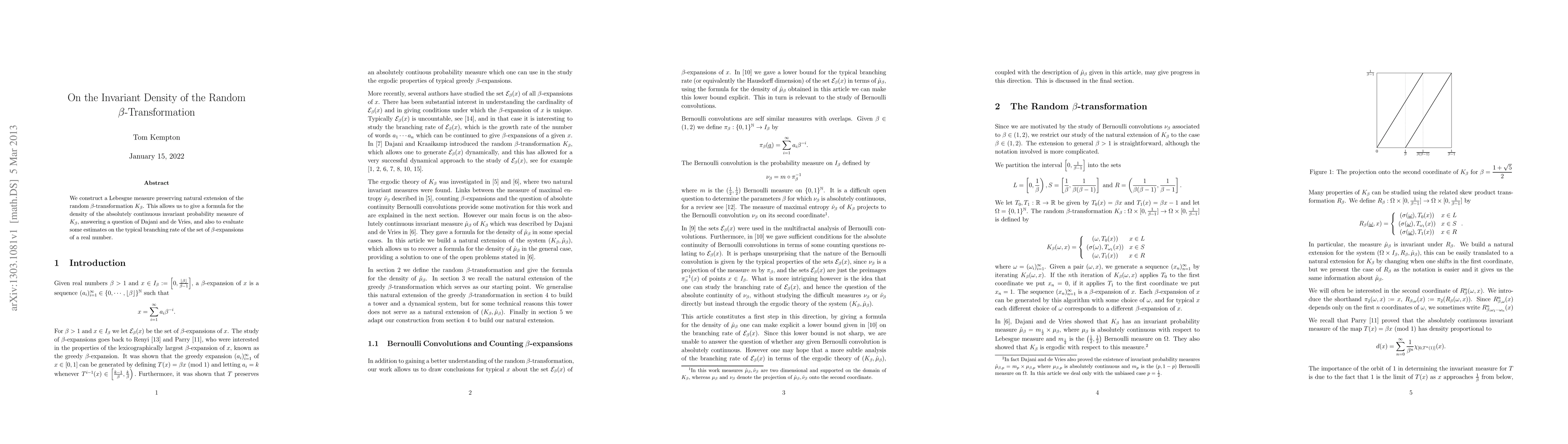 This paper constructs a Lebesgue measure preserving extension of the random beta-transformation and provides a formula for the density of the invariant probability measure, addressing a question posed by Dajani and de Vries, and evaluates estimates on the typical branching rate of beta-expansions.