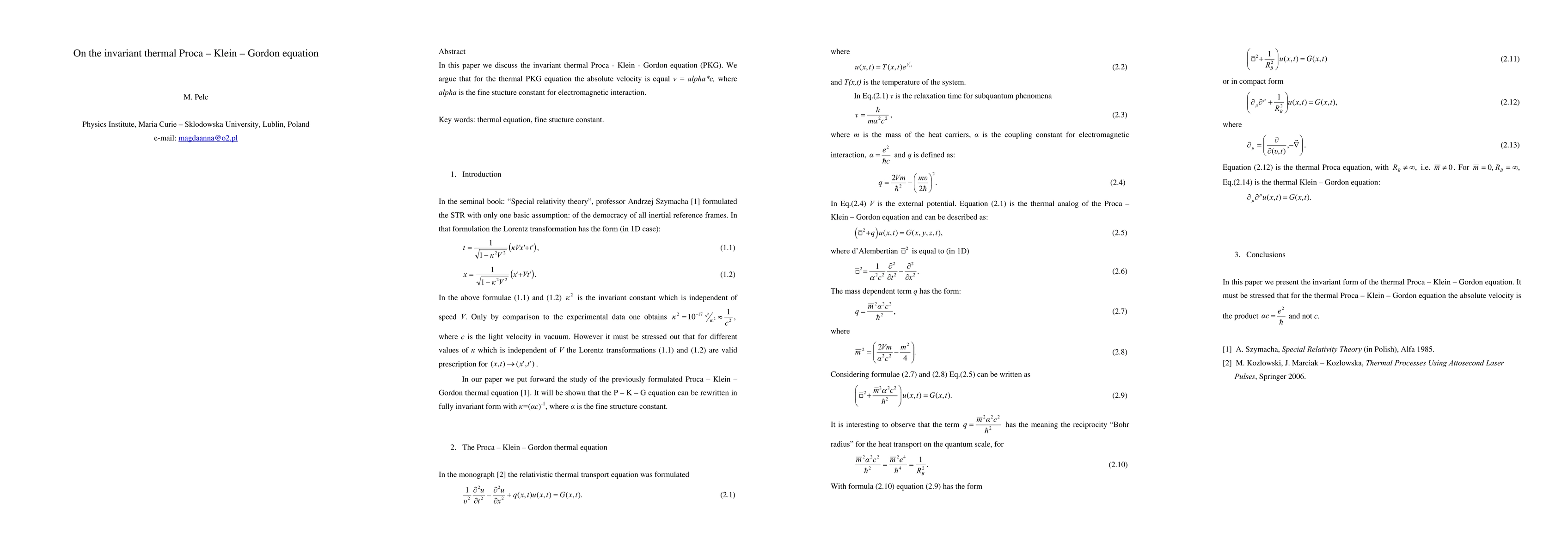 Summary: This paper explores the invariant thermal Proca-Klein-Gordon equation, asserting that its absolute velocity is proportional to the speed of light, with a proportionality constant defined by the fine structure constant for electromagnetic interactions.