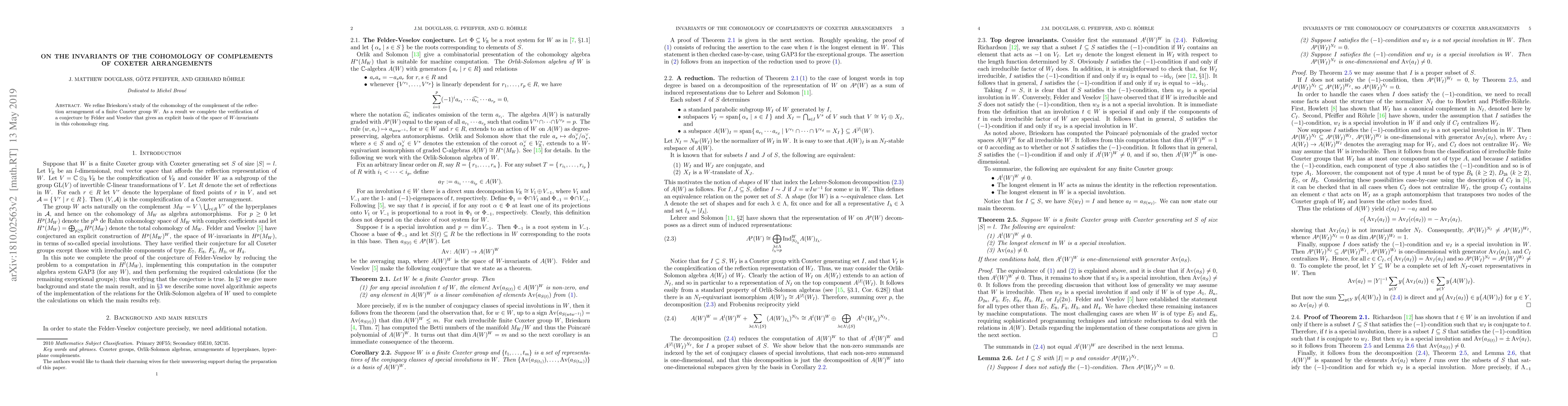 We refine Brieskorn's study of the cohomology of the complement of the reflection arrangement of a finite Coxeter group $W$. As a result we complete the verification of a conjecture by Felder and Veselov that gives an explicit basis of the space of $W$-invariants in this cohomology ring.