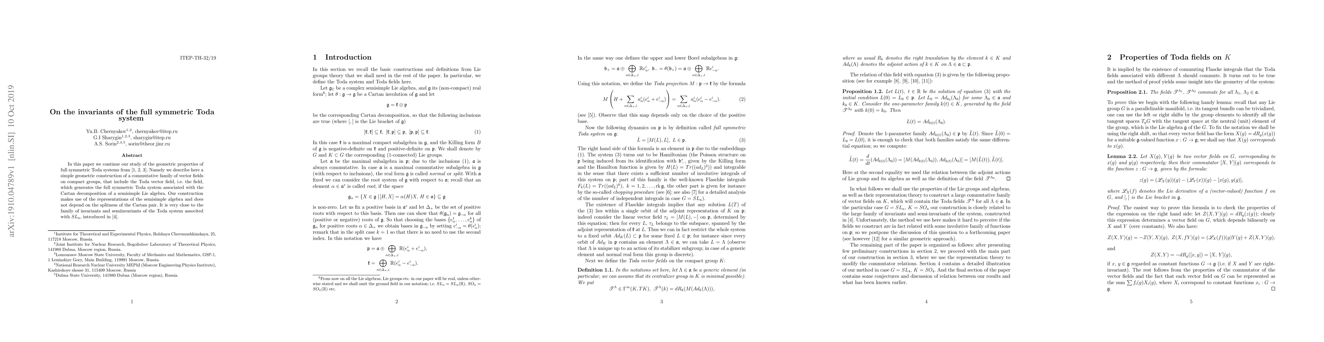 In this paper we continue our study of the geometric properties of full symmetric Toda systems from \cite{CSS14,CSS17,CSS19}. Namely we describe here a simple geometric construction of a commutative family of vector fields on compact groups, that include the Toda vector field, i.e. the field, which generates the full symmetric Toda system associated with the Cartan decomposition of a semisimple Lie algebra. Our construction makes use of the representations of the semisimple algebra and does not depend on the splitness of the Cartan pair. It is very close to the family of invariants and semiinvariants of the Toda system associted with $SL_n$, introduced in \cite{CS}.