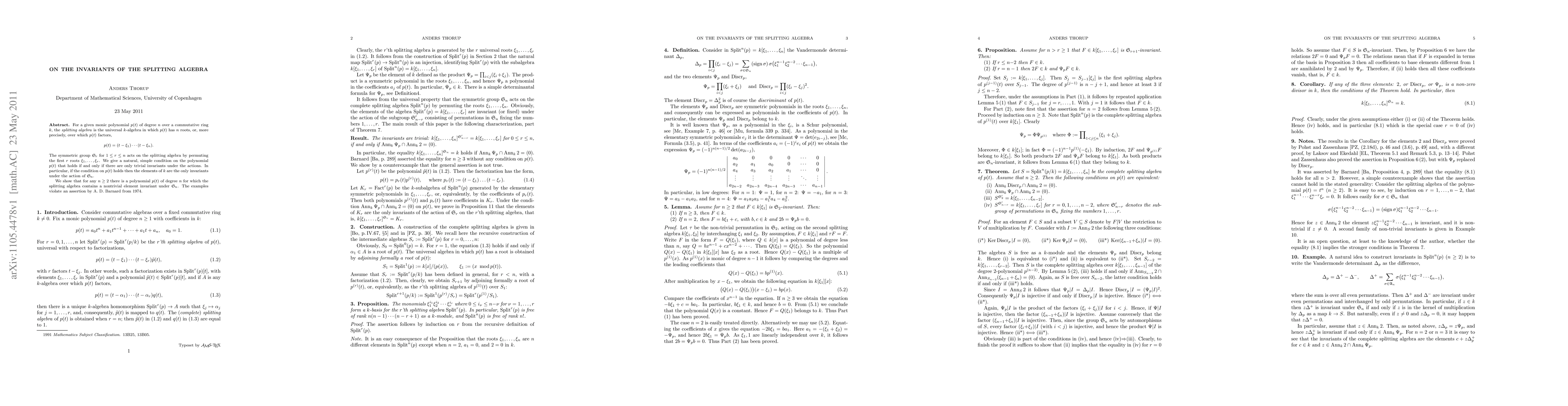 For a given monic polynomial $p(t)$ of degree $n$ over a commutative ring $k$, the splitting algebra is the universal $k$-algebra in which $p(t)$ has $n$ roots, or, more precisely, over which $p(t)$ factors, $p(t)=(t-\xi_1)...(t-\xi_n)$. The symmetric group $S_r$ for $1\le r\le n$ acts on the splitting algebra by permuting the first $r$ roots $\xi_1,...,\xi_r$. We give a natural, simple condition on the polynomial $p(t)$ that holds if and only if there are only trivial invariants under the actions. In particular, if the condition on $p(t)$ holds then the elements of $k$ are the only invariants under the action of $S_n$. We show that for any $n\ge 2$ there is a polynomial $p(t)$ of degree $n$ for which the splitting algebra contains a nontrivial element invariant under $S_n$. The examples violate an assertion by A. D. Barnard from 1974.