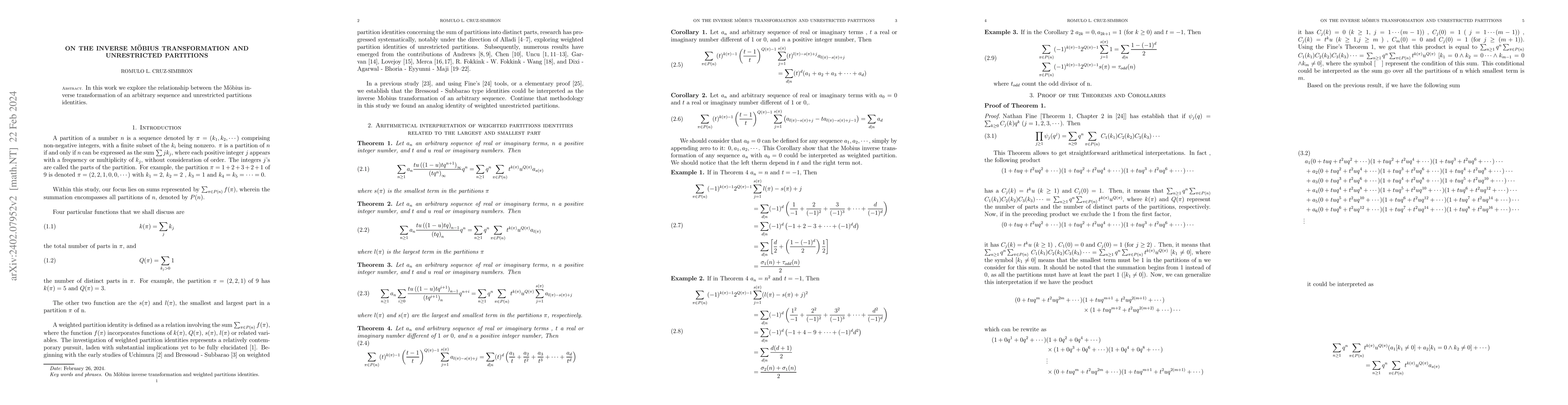 Summary: This study investigates the connection between the Mobius inverse transformation applied to sequences and the identities derived from unrestricted partitions. The research aims to uncover how these mathematical concepts interact and influence each other.