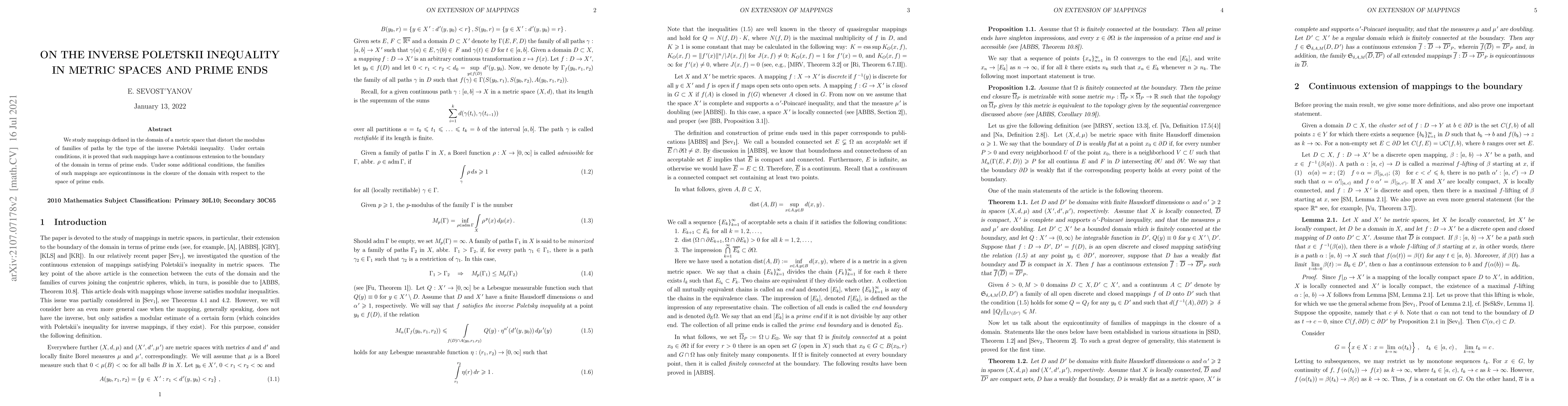 This paper investigates mappings in metric spaces that distort path moduli via an inverse Poletskii inequality, proving their continuous extension to the boundary in terms of prime ends under specific conditions. It further establishes equicontinuity for such mapping families within the domain closure concerning the prime ends framework.