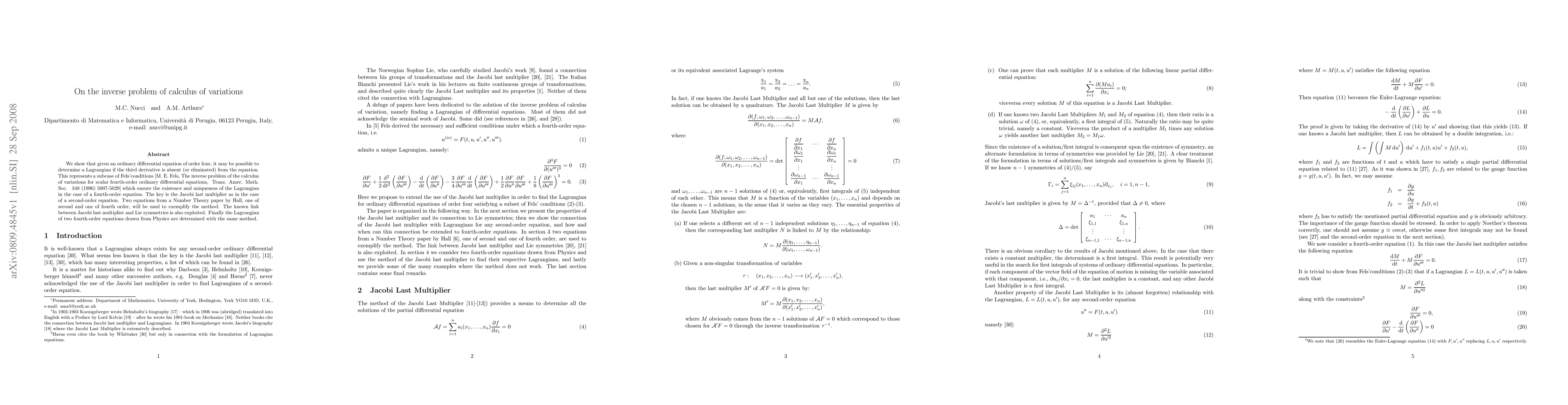 We show that given an ordinary differential equation of order four, it may be possible to determine a Lagrangian if the third derivative is absent (or eliminated) from the equation. This represents a subcase of Fels'conditions [M. E. Fels, The inverse problem of the calculus of variations for scalar fourth-order ordinary differential equations, Trans. Amer. Math. Soc. 348 (1996) 5007-5029] which ensure the existence and uniqueness of the Lagrangian in the case of a fourth-order equation. The key is the Jacobi last multiplier as in the case of a second-order equation. Two equations from a Number Theory paper by Hall, one of second and one of fourth order, will be used to exemplify the method. The known link between Jacobi last multiplier and Lie symmetries is also exploited. Finally the Lagrangian of two fourth-order equations drawn from Physics are determined with the same method.