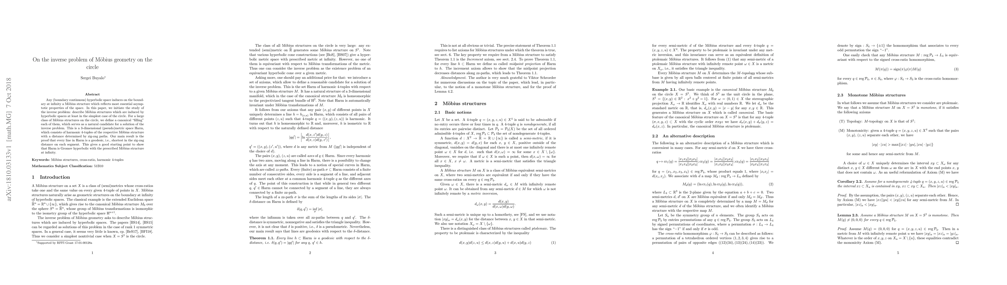 The paper introduces a 3-dimensional (pseudo)metric space Harm and proves that it is Gromov hyperbolic, providing a solution to the inverse problem of Moebius geometry on the circle for a large class of structures.