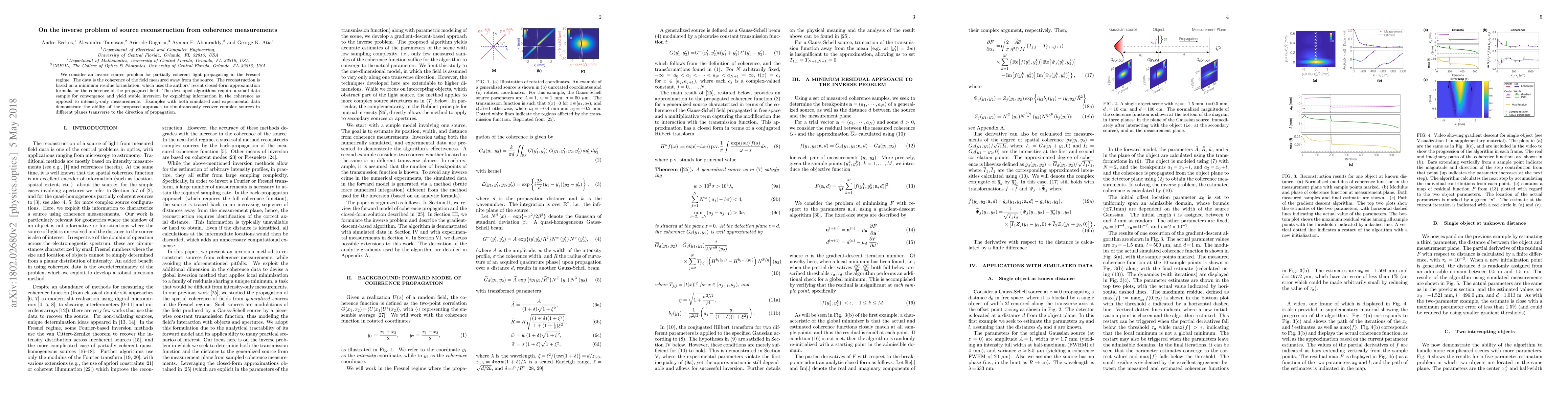 This paper addresses the inverse problem of reconstructing light sources from coherence measurements in the Fresnel regime, proposing a minimum residue formulation that leverages the authors' closed-form coherence approximation. The developed algorithms achieve stable inversion using coherence data, demonstrating successful recovery of complex sources from both simulated and experimental data.