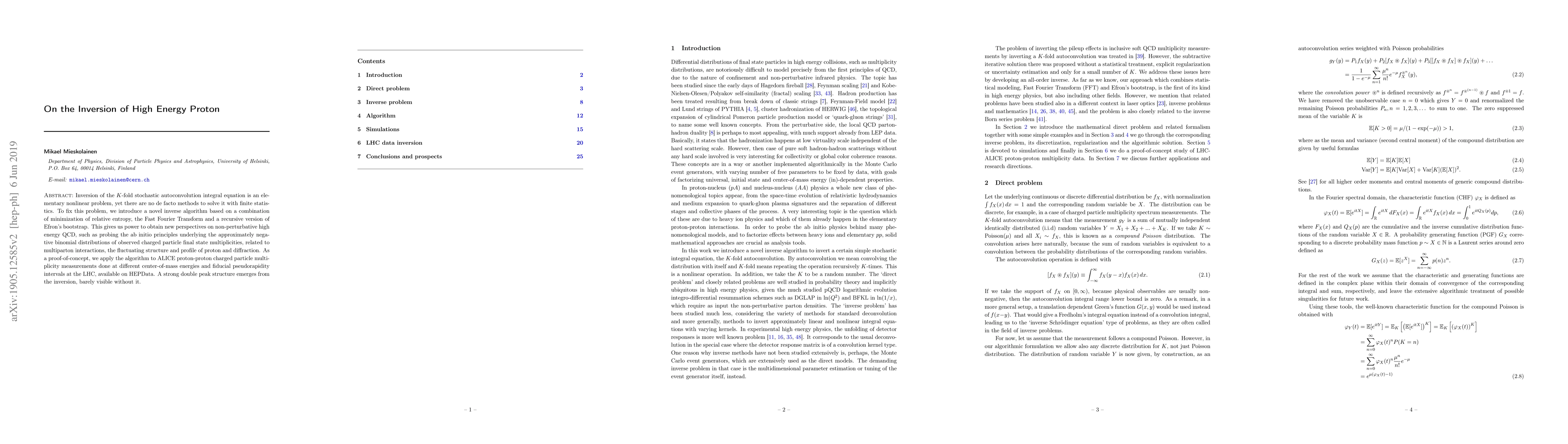 Inversion of the K-fold stochastic autoconvolution integral equation is an elementary nonlinear problem, yet there are no de facto methods to solve it with finite statistics. To fix this problem, we introduce a novel inverse algorithm based on a combination of minimization of relative entropy, the Fast Fourier Transform and a recursive version of Efron's bootstrap. This gives us power to obtain new perspectives on non-perturbative high energy QCD, such as probing the ab initio principles underlying the approximately negative binomial distributions of observed charged particle final state multiplicities, related to multiparton interactions, the fluctuating structure and profile of proton and diffraction. As a proof-of-concept, we apply the algorithm to ALICE proton-proton charged particle multiplicity measurements done at different center-of-mass energies and fiducial pseudorapidity intervals at the LHC, available on HEPData. A strong double peak structure emerges from the inversion, barely visible without it.