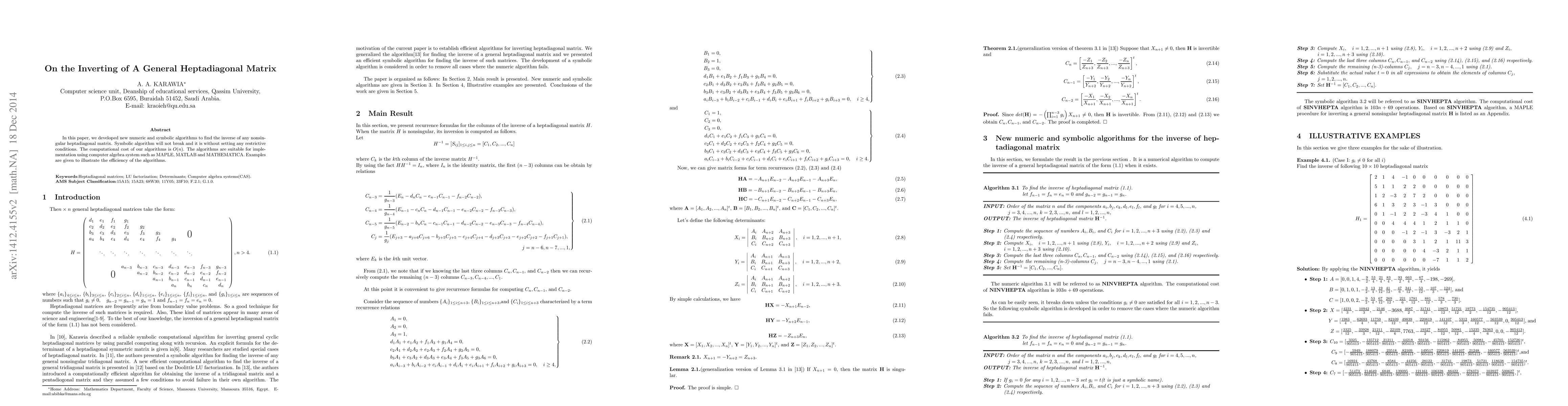This paper introduces new numeric and symbolic algorithms for finding the inverse of any nonsingular heptadiagonal matrix, with a computational cost of $O(n)$ and no restrictive conditions. The algorithms are suitable for implementation in computer algebra systems like MAPLE, MATLAB, and MATHEMATICA.