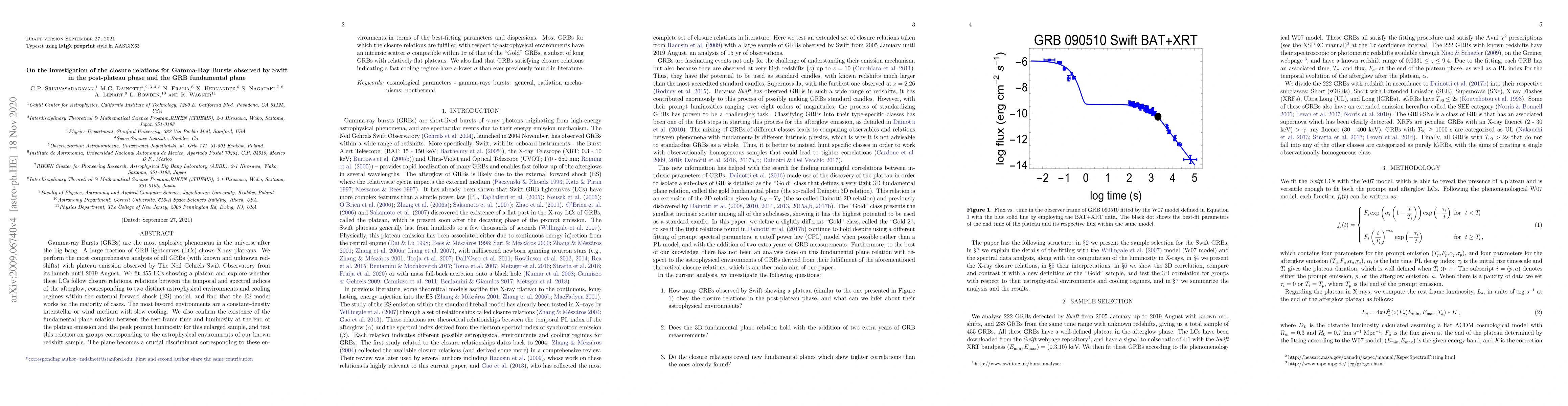 This study analyzes 455 Gamma-Ray Bursts with plateau emission from Swift data, finding that most follow closure relations indicating constant density interstellar or wind medium environments with slow cooling. The results also reveal a fundamental plane relation between luminosity, rest-frame time, and peak prompt luminosity, which helps distinguish astrophysical environments.