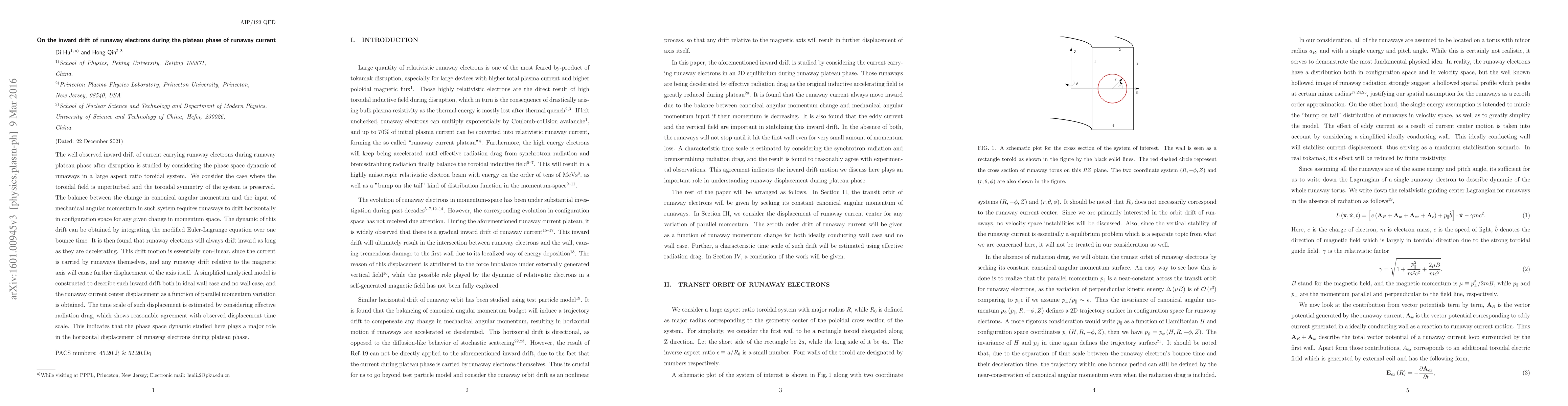 The well observed inward drift of current carrying runaway electrons during runaway plateau regime after disruption is studied by considering the phase space dynamic of runaways in a large aspect ratio toroidal system. We consider the case where the toroidal field is unperturbed and the toroidal symmetry of the system is preserved. The balance between the change in canonical angular momentum and the input of mechanical angular momentum in such system requires runaways to drift horizontally in configuration space for any given change in momentum space. The dynamic of this drift can be obtained by taking the variation of canonical angular momentum. It is then found that runaway electrons will always drift inward as long as they are decelerating. This drift motion is essentially non-linear, since the current is carried by runaways themselves, and any runaway drift relative to the magnetic axis will cause further displacement of the axis itself. A simplified analytical model is constructed to describe such inward drift both in ideal wall case and no wall case, and the runaway current center displacement as a function of parallel momentum variation is obtained. The time scale of such displacement is estimated by considering effective radiation drag, which shows reasonable agreement with observed displacement time scale. This indicates that the phase space dynamic studied here plays a major role in the horizontal displacement of runaway electrons during plateau regime.