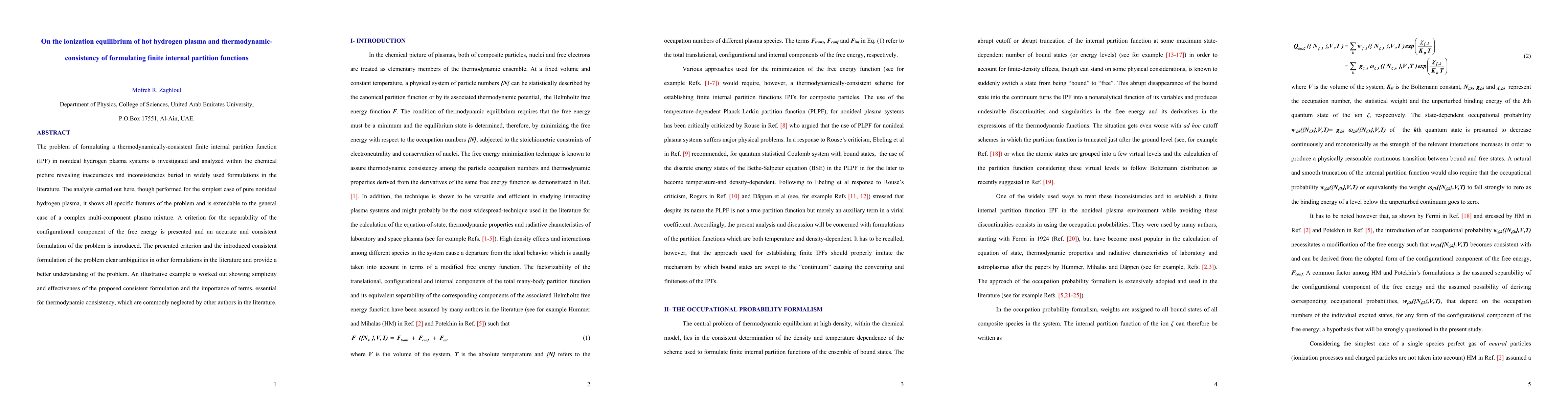 This paper examines the issue of creating a thermodynamically consistent finite internal partition function for nonideal hydrogen plasma, identifying inaccuracies in existing literature formulations. It introduces an accurate, consistent formulation and a criterion for separability, demonstrating its effectiveness through an example, crucial for understanding complex multi-component plasma mixtures.