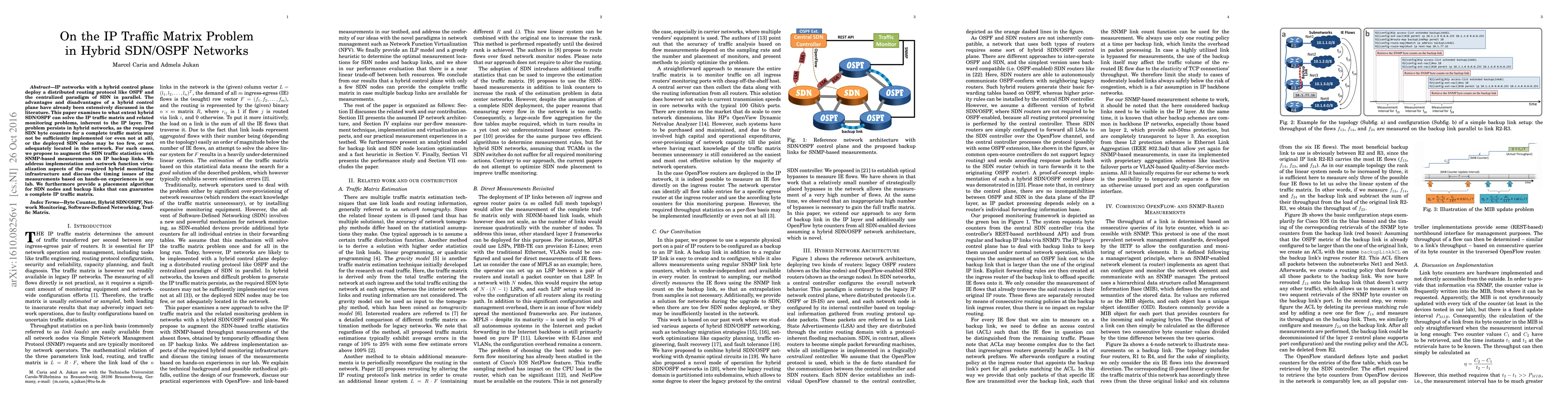 This paper investigates the challenges of obtaining a complete IP traffic matrix in hybrid SDN/OSPF networks, proposing an augmentation of SDN traffic statistics with SNMP-based measurements on backup links. It also presents a placement algorithm for SDN nodes and backup links to ensure a comprehensive traffic matrix.