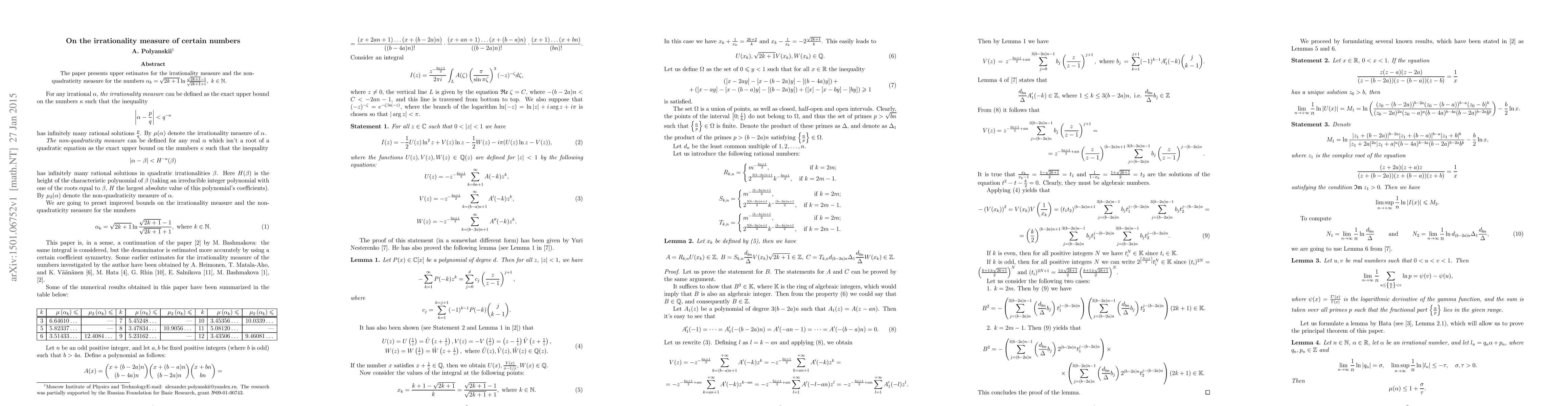This paper estimates upper bounds for the irrationality measure of certain numbers in a series defined by $rac{ ext{ln}(rac{ ext{sqrt}(2k+1)-1}{ ext{sqrt}(2k+1)+1})}{ ext{sqrt}(2k+1)}}$. The key findings relate to non-quadratic properties of these numbers, suggesting potential connections between them and known mathematical concepts.