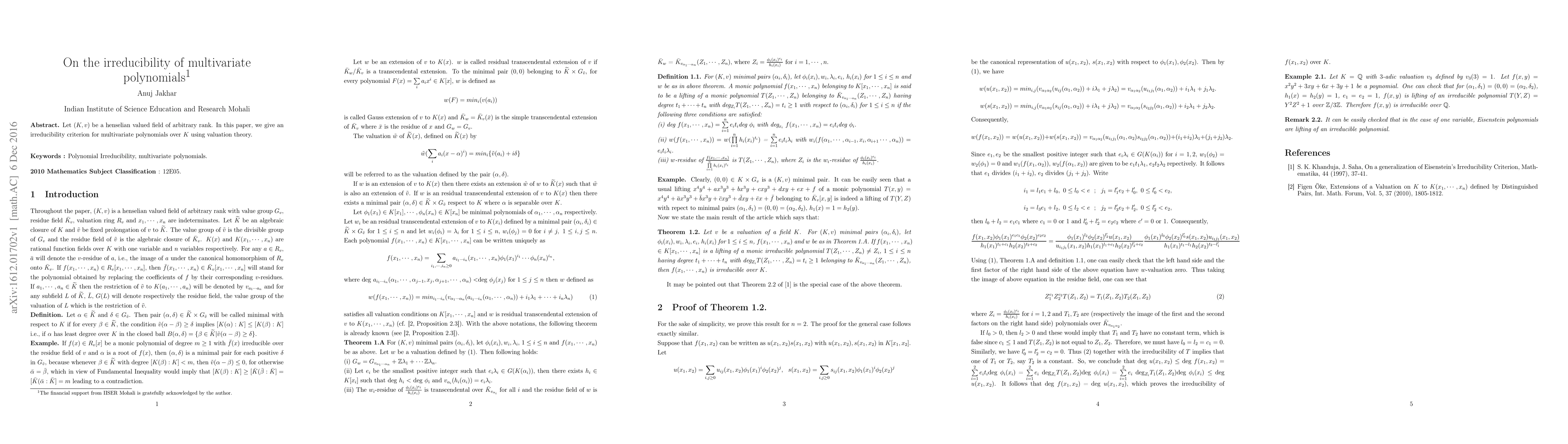Summary: This paper presents an irreducibility criterion for multivariate polynomials over henselian valued fields, leveraging valuation theory to determine the polynomial's indivisibility.