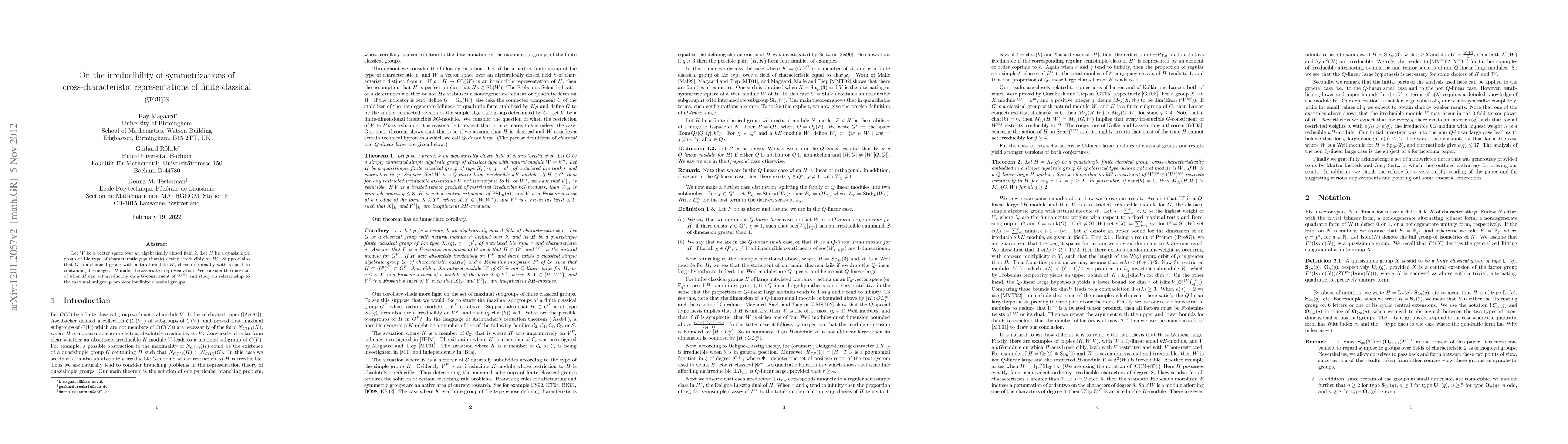 The paper examines the irreducibility of representations where a quasisimple group of Lie type acts on a classical group's natural module, focusing on symmetrizations of tensor products, and relates this to the maximal subgroup problem in finite classical groups.