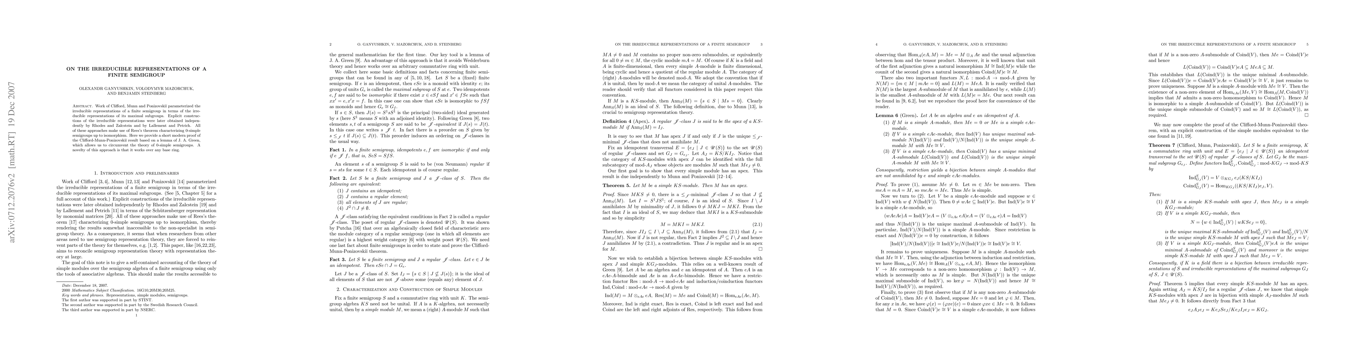 Work of Clifford, Munn and Ponizovski{\u\i} parameterized the irreducible representations of a finite semigroup in terms of the irreducible representations of its maximal subgroups. Explicit constructions of the irreducible representations were later obtained independently by Rhodes and Zalcstein and by Lallement and Petrich. All of these approaches make use of Rees's theorem characterizing 0-simple semigroups up to isomorphism. Here we provide a short modern proof of the Clifford-Munn-Ponizovski{\u\i} result based on a lemma of J. A. Green, which allows us to circumvent the theory of 0-simple semigroups. A novelty of this approach is that it works over any base ring.