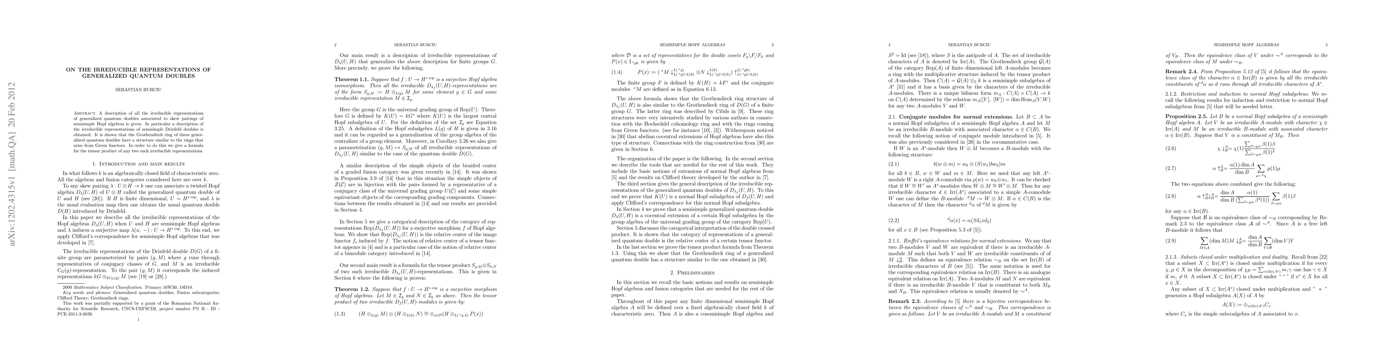 This paper provides a comprehensive description of the irreducible representations of generalized quantum doubles linked to skew pairings of semisimple Hopf algebras, specifically focusing on semisimple Drinfeld doubles. It establishes a structural similarity between the Grothendieck rings of these quantum doubles and rings from Green functors, accompanied by a formula for the tensor product of irreducible representations.