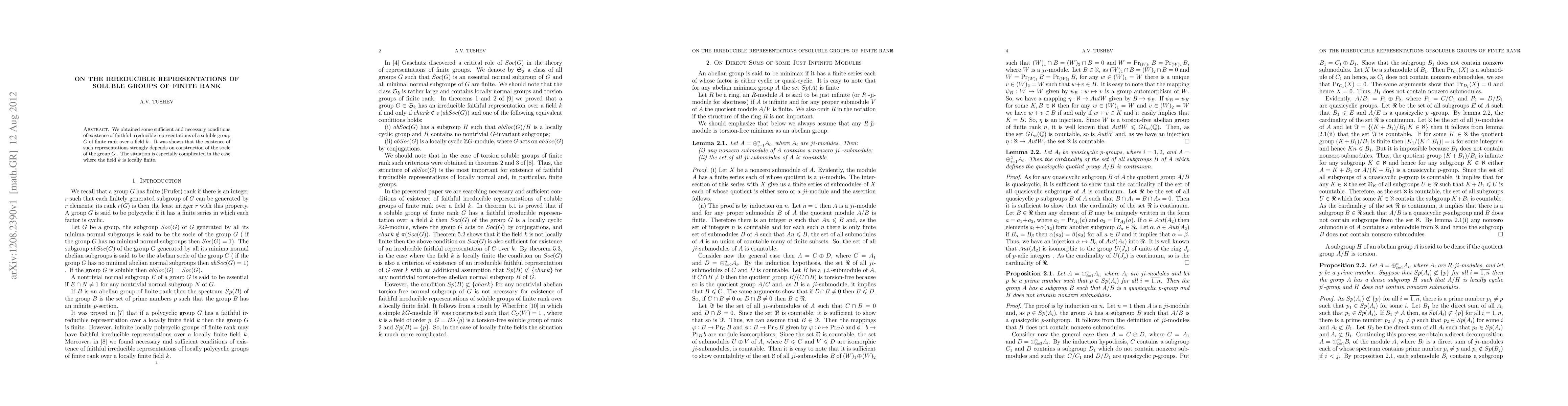 Researchers found conditions for soluble groups of finite rank to have faithful irreducible representations over a field k, with construction of the socle playing a crucial role. The existence of such representations is complicated when the field k is locally finite.