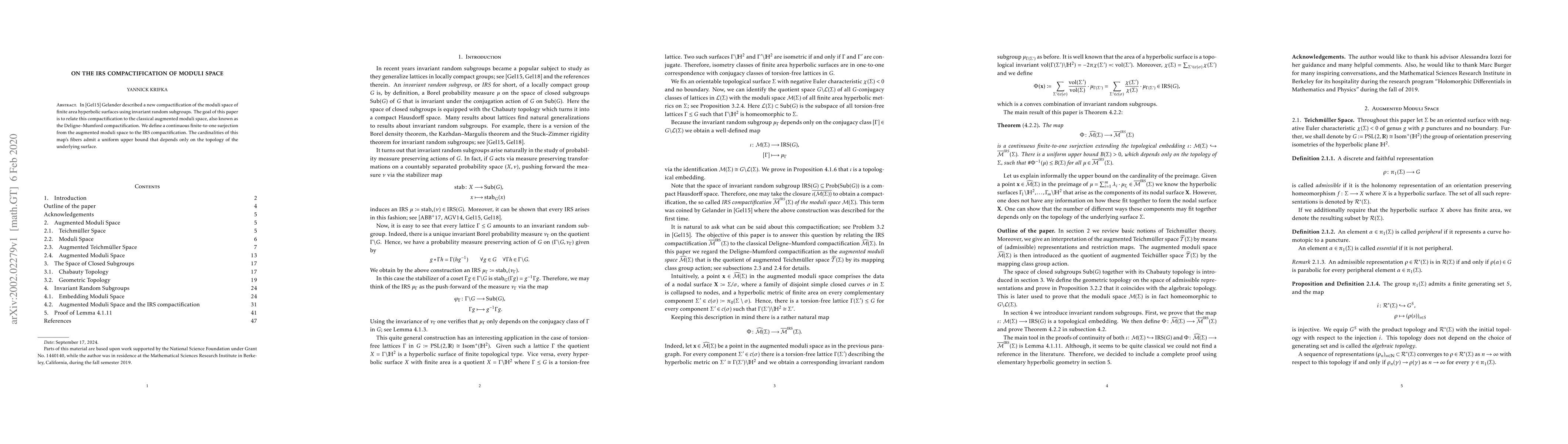 This paper establishes a continuous map from the Deligne-Mumford compactification to an IRS (Invariant Random Subgroup) compactification of moduli space, showing that the cardinalities of its fibers have a uniform upper bound.