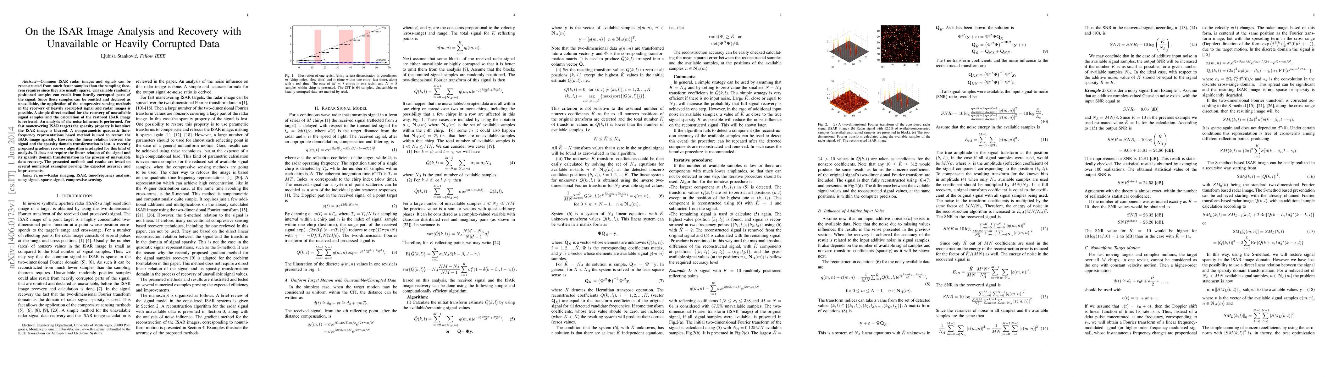 Common ISAR radar images and signals can be reconstructed from much fewer samples than the sampling theorem requires since they are usually sparse. Unavailable randomly positioned samples can result from heavily corrupted parts of the signal. Since these samples can be omitted and declared as unavailable, the application of the compressive sensing methods in the recovery of heavily corrupted signal and radar images is possible. A\ simple direct method for the recovery of unavailable signal samples and the calculation of the restored ISAR image is reviewed. An analysis of the noise influence is performed. For fast maneuvering ISAR targets the sparsity property is lost since the ISAR image is blurred. A nonparametric quadratic time-frequency representations based method is used to restore the ISAR image sparsity. However, the linear relation between the signal and the sparsity domain transformation is lost. A recently proposed gradient recovery algorithm is adapted for this kind of analysis. It does not require the linear relation of the signal and its sparsity domain transformation in the process of unavailable data recovery. The presented methods and results are tested on several numerical examples proving the expected accuracy and improvements.