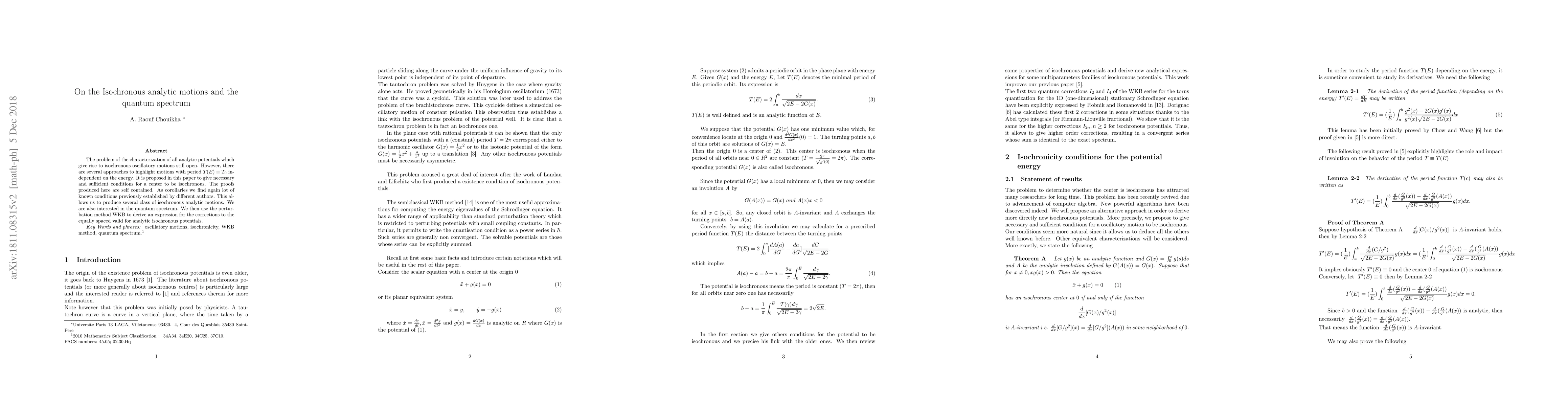 The problem of the characterization of all analytic potentials which give rise to isochronous oscillatory motions still open. However, there are several approaches to highlight motions with period $T(E) \equiv T_0$ independent on the energy. It is proposed in this paper to give necessary and sufficient conditions for a center to be isochronous. The proofs produced here are self contained. As corollaries we find again lot of known conditions previously established by different authors. This allows us to produce several class of isochronous analytic motions. We are also interested in the quantum spectrum. We then use the perturbation method WKB to derive an expression for the corrections to the equally spaced valid for analytic isochronous potentials.