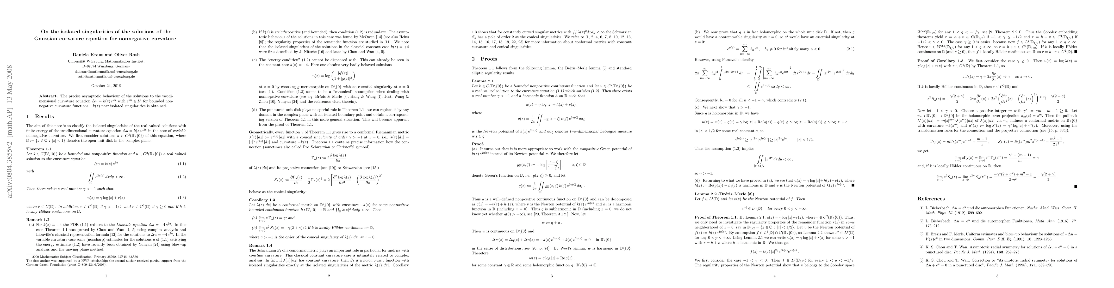 The precise asymptotic behaviour of the solutions to the twodimensional curvature equation $\Delta u=k(z) e^{2 u}$ with $e^{2 u} \in L^1$ for bounded nonnegative curvature functions $-k(z)$ near isolated singularities is obtained.