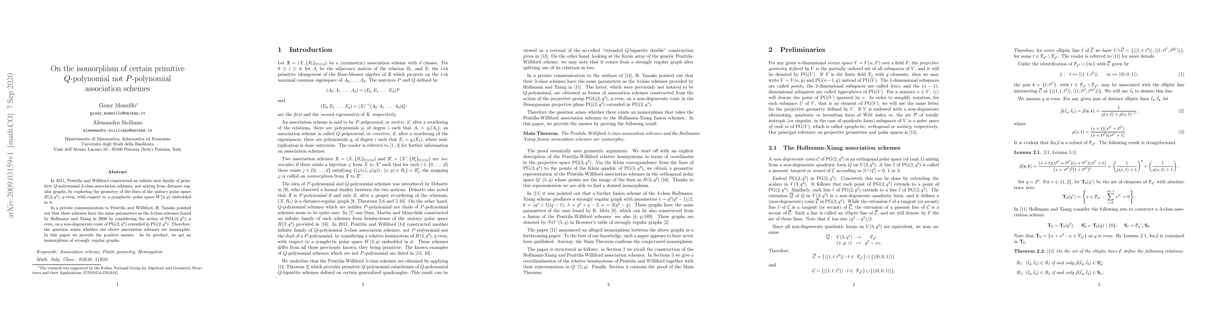 In 2011, Penttila and Williford constructed an infinite new family of primitive $Q$-polynomial 3-class association schemes, not arising from distance regular graphs, by exploring the geometry of the lines of the unitary polar space $H(3,q^2)$, $q$ even, with respect to a symplectic polar space $W(3,q)$ embedded in it. In a private communication to Penttila and Williford, H.~Tanaka pointed out that these schemes have the same parameters as the 3-class schemes found by Hollmann and Xiang in 2006 by considering the action of $\mathrm{PGL}(2,q^2)$, $q$ even, on a non-degenerate conic of $\mathrm{PG}(2,q^2)$ extended in $\mathrm{PG}(2,q^4)$. Therefore, the question arises whether the above association schemes are isomorphic. In this paper we provide the positive answer. As by product, we get an isomorphism of strongly regular graphs.
